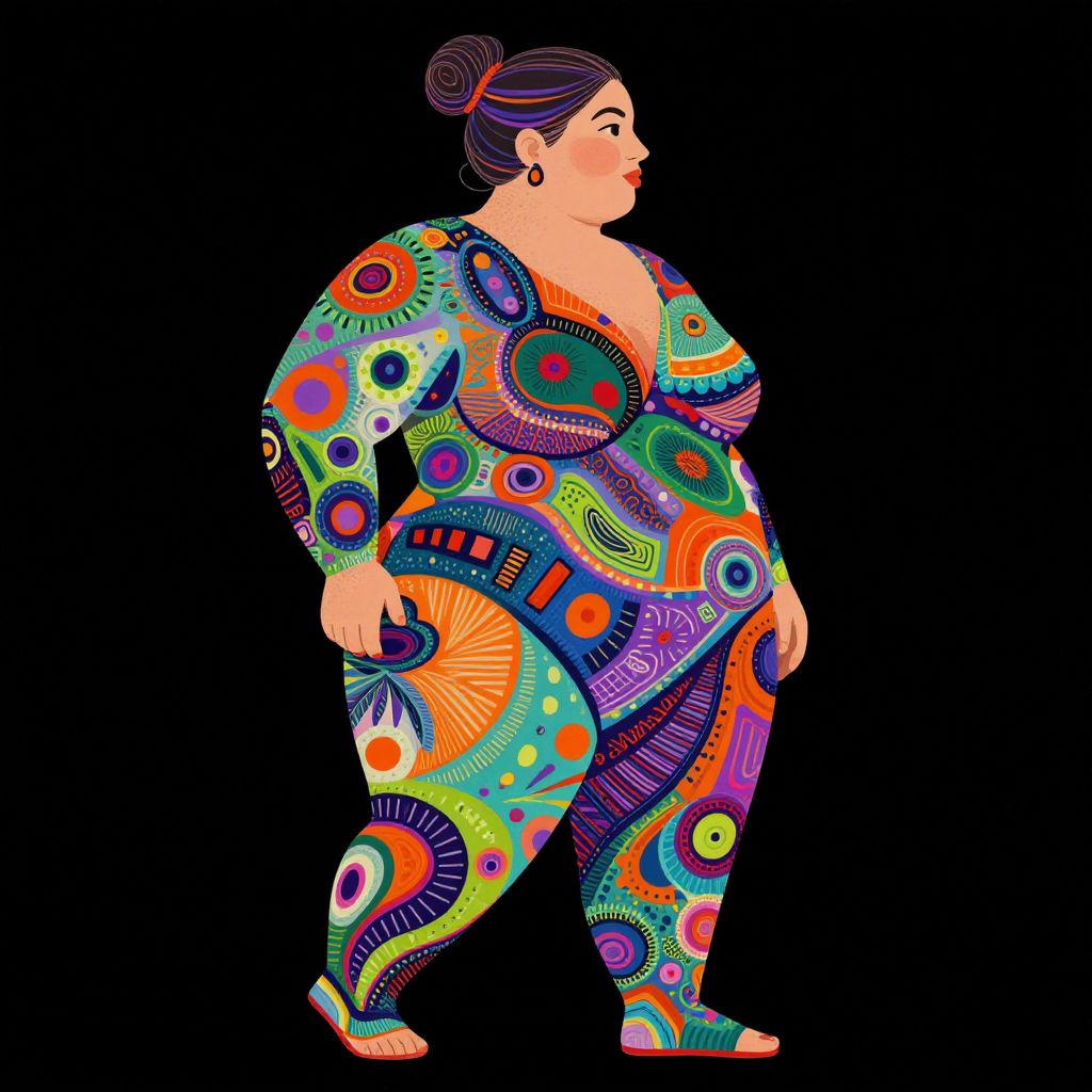 Digital illustration of a plus-sized woman with fair skin and dark hair in a bun, wearing a vibrant, colorful full-body outfit adorned with psychedelic patterns including circles, spirals, and abstract shapes in orange, green, purple, blue, and pink. She stands in profile against a solid black background, with her right arm slightly bent and her left arm hanging by her side. Her expression is neutral, and she wears small, round earrings. The bold, intricate patterns contrast sharply with the dark background, emphasizing her figure and the lively design of her outfit.