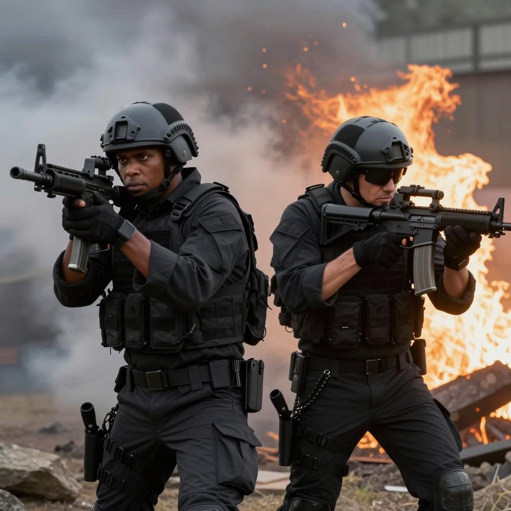 Call of duty style, high-tech spec-ops mission in the near future featuring elite sniper team with ghillie suits and spotter scopes in suburban neighborhood with damaged houses and burning vehicles, tight medium shot on the squad leader, background blurred with motion, cinematic lighting, dynamic composition, hyper-realistic game key art, detailed armor and weapons, sparks and smoke in the air, no blood, no gore, ultra-detailed, 4k