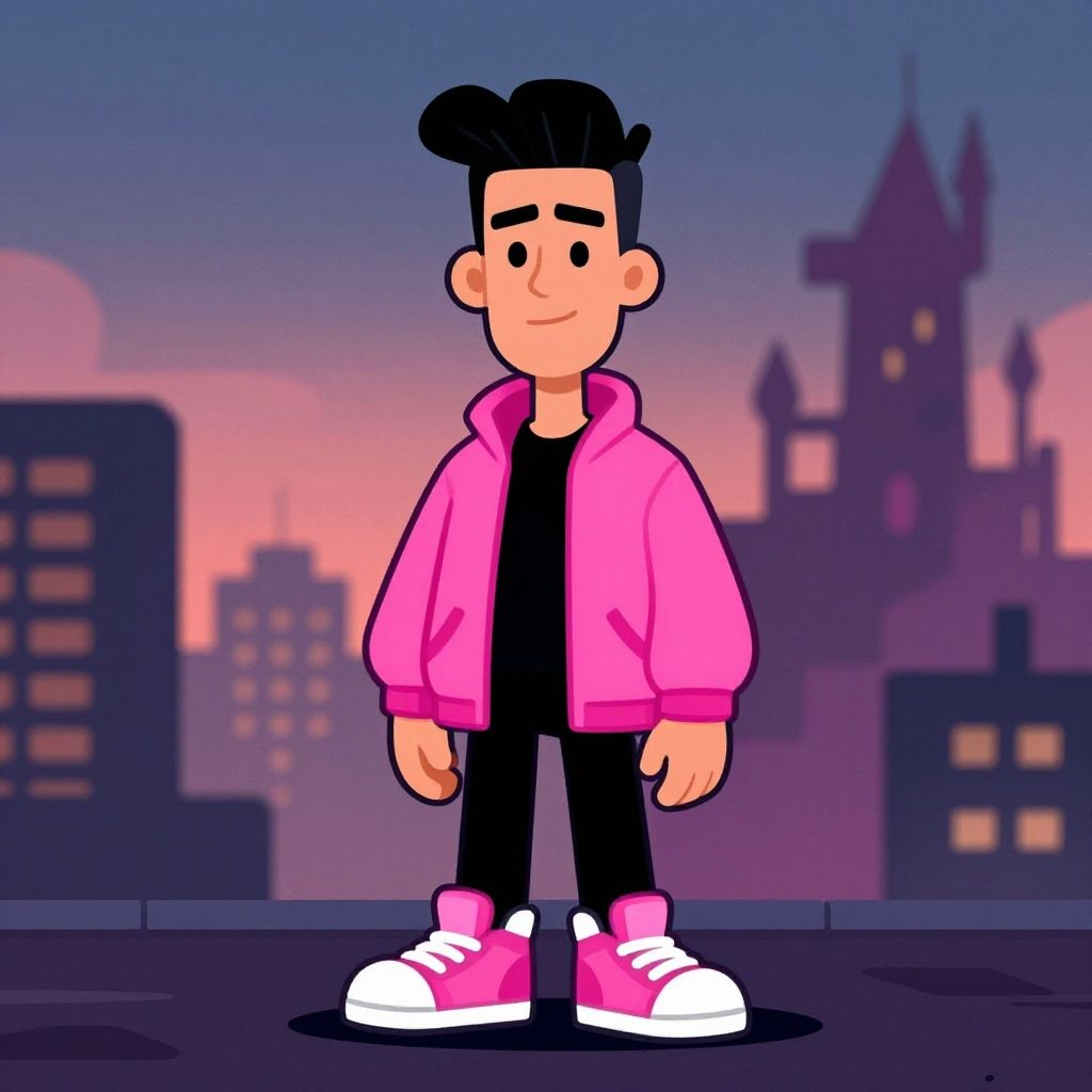 A digital cartoon illustration of a young man with light brown skin and black hair styled in a small bun. He wears a bright pink hoodie, black shirt, black pants, and pink and white sneakers. He stands confidently on a rooftop with a purple and pink gradient cityscape in the background, featuring silhouette buildings and a castle-like structure. The character has a simple, smiling face with black dot eyes and a small nose. The style is vibrant and playful, with bold outlines and flat colors.