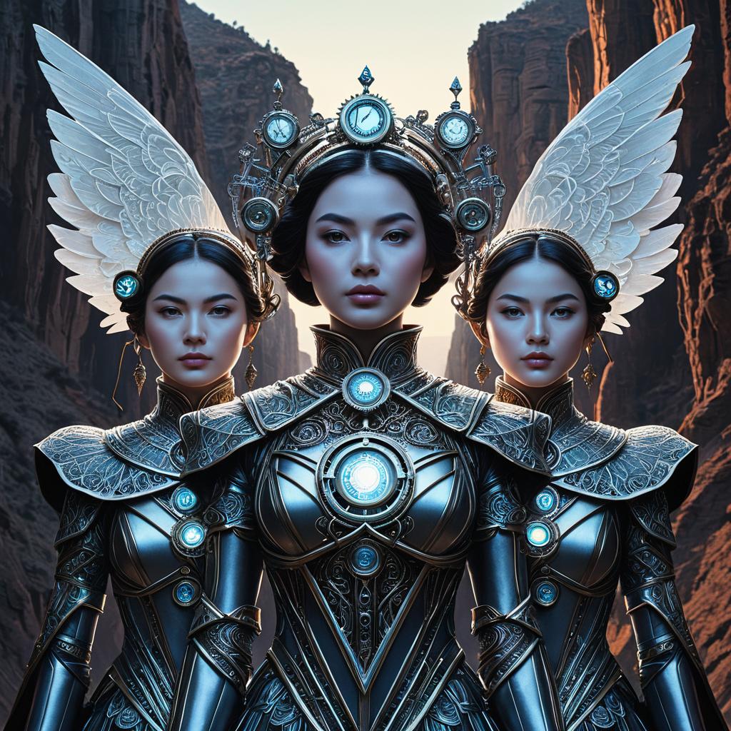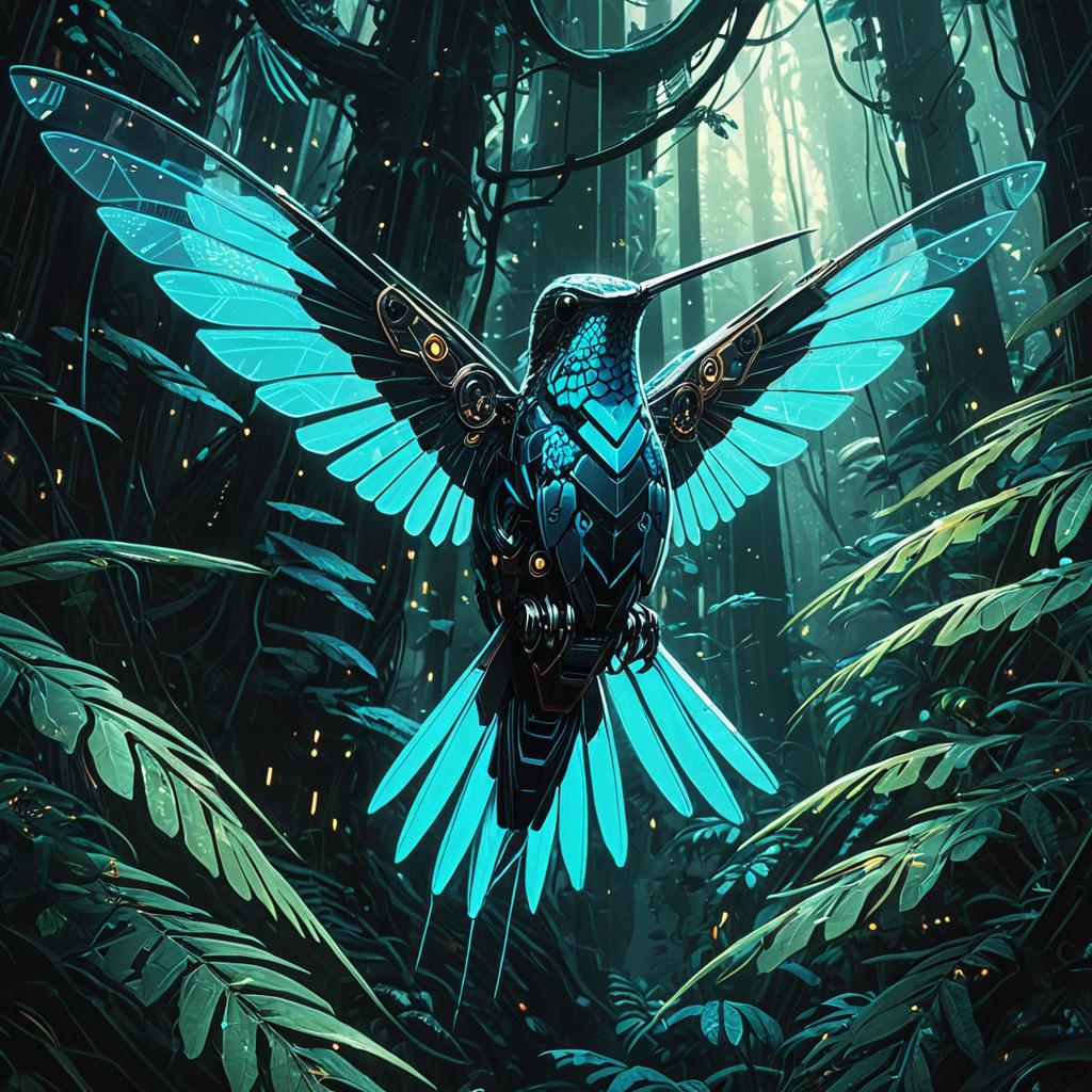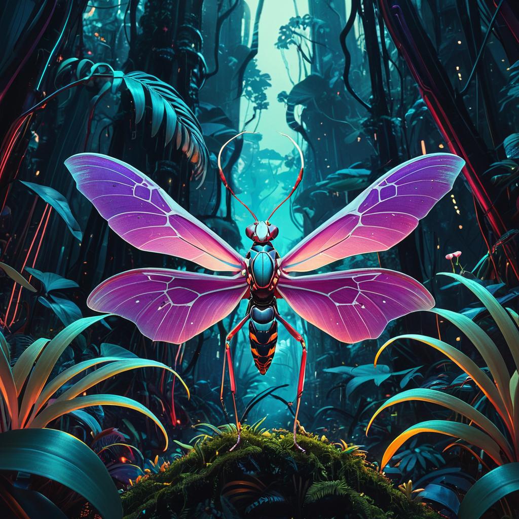 Symmetry!! portrait of a crystal spider mech with neon accents set against a deep neon rainforest at twilight, featuring intricate metallic filigree and luminous circuitry, digital painting, concept art, ArtStation quality, smooth, sharp focus, illustration by Artgerm, Beeple, Syd Mead, 8K.