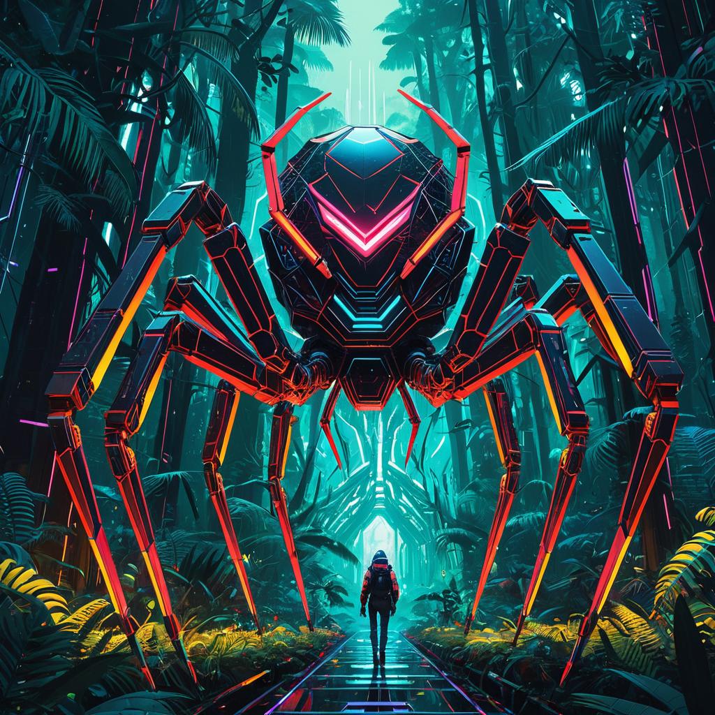 Digital painting of a large crystal spider mech with neon red and orange accents, standing symmetrically in the middle of a dense, neon-lit rainforest at twilight. The mechanical spider features intricate metallic filigree and glowing circuitry details. A lone figure with a backpack walks ahead on a reflective path surrounded by lush tropical plants. The scene showcases a futuristic, sci-fi atmosphere with sharp focus and vibrant colors.