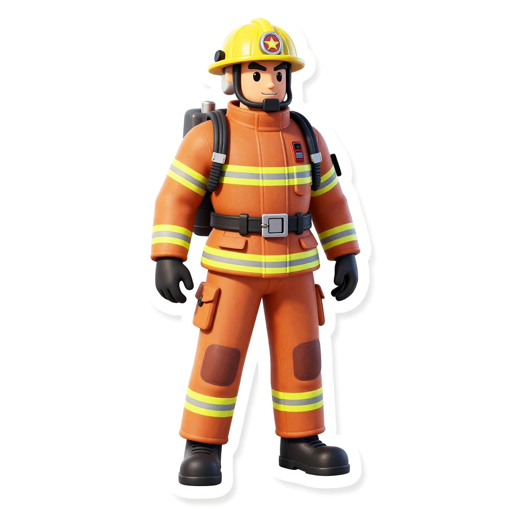 Ultra-detailed 3D render of a resin sticker depicting a brave firefighter in full protective gear including a yellow helmet with a badge, orange suit with reflective stripes, black gloves, and boots. The character is shown in a full-length isometric style on a white background, designed as a game asset.
