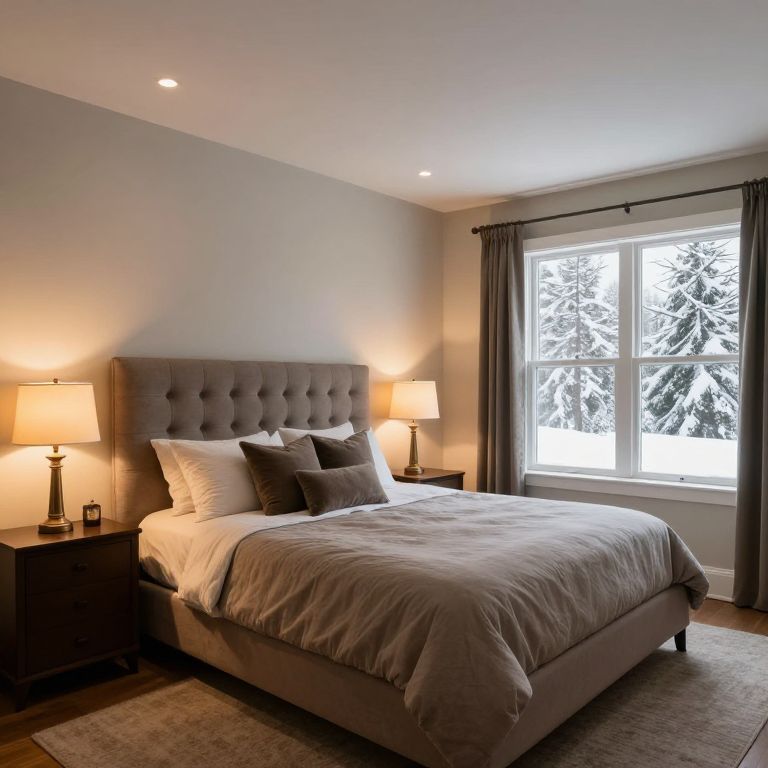 Cozy bedroom featuring a king-sized bed with a tufted headboard, flanked by two dark wooden nightstands each holding a warm-toned lamp, situated beneath recessed ceiling lights and near a large window offering a serene view of snow-covered trees outside.