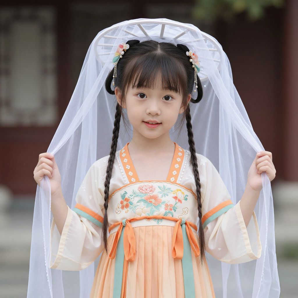 Promising Young Girl Costume, asian girl in traditional dress with veil and tiable