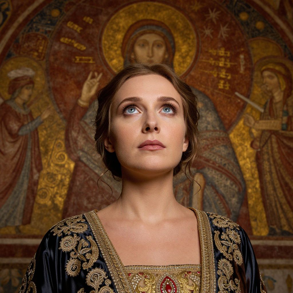 Photograph of a young Caucasian woman with fair skin and blue eyes, gazing upward with a contemplative expression. She has brown hair pulled back and wears an ornate black dress with gold embroidery. The background features a detailed, golden Byzantine-style mosaic depicting a haloed figure with a serene expression, surrounded by smaller figures, creating a rich, textured, and historical context. The mosaic's intricate patterns and warm hues contrast with the woman's soft, natural appearance, emphasizing her modern elegance against ancient artistry. The image blends contemporary realism with historical art.