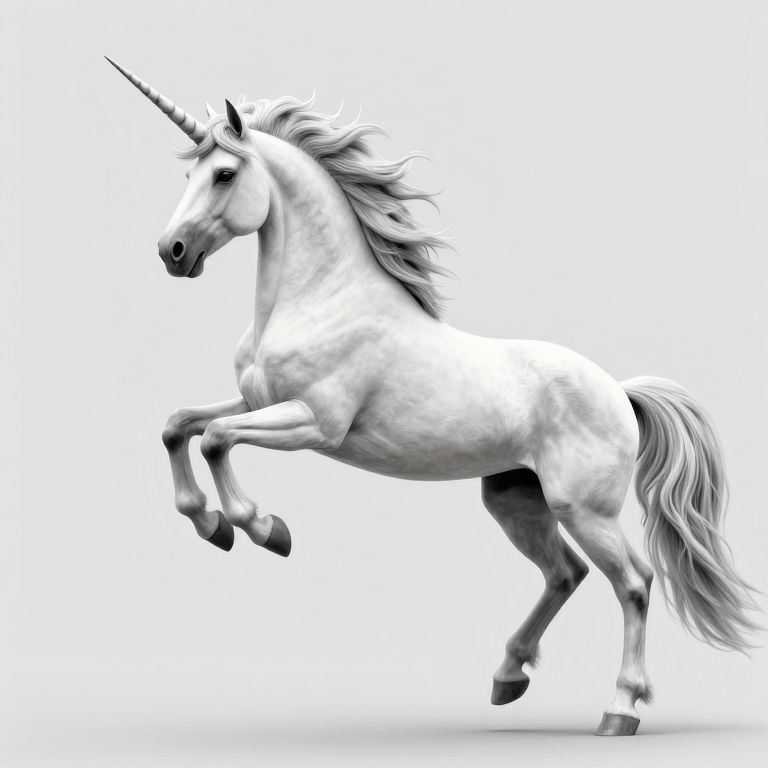 The image depicts a sideview of a full-body unicorn in mid-air, captured from a wide angle. The unicorn, rendered in a monochromatic palette, showcases a sleek, muscular form with a flowing mane and tail. Its body is elongated, with a prominent, curved horn protruding from its forehead. The unicorn's legs are captured in a dynamic pose, with one front leg extended forward and the other bent, while its hind legs are tucked under its body, giving the impression of movement and grace. The background is a plain, light gray, which contrasts with the unicorn's detailed, textured fur, emphasizing its form and the fluidity of its pose. The overall composition is balanced, with the unicorn centrally positioned, drawing the viewer's eye to its majestic presence.
