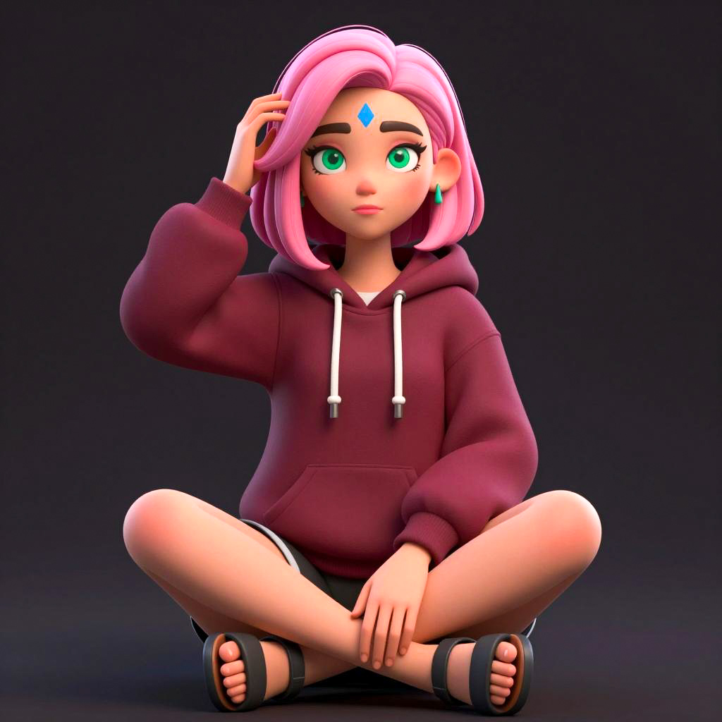 3D digital illustration of a pink-haired woman with green eyes, sitting cross-legged on a black background. She wears a maroon hoodie with white drawstrings, black shorts, and black sandals. Her right hand touches her hair, and her left hand rests on her knee. A blue diamond-shaped mark is on her forehead. Her expression is neutral.