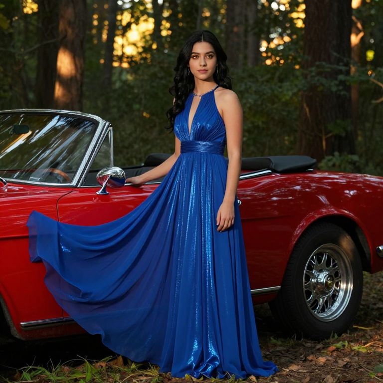 A cinematic, moody prom scene in a forest clearing during golden hour, where a soft light filters through tree canopies, and a beautiful teenage girl with long black hair and amber eyes wears a cobalt blue prom dress with a high neckline and flowing chiffon skirt, standing beside a vintage red convertible, the dress shimmering under the dappled sunlight and creating a dreamy, romantic atmosphere.