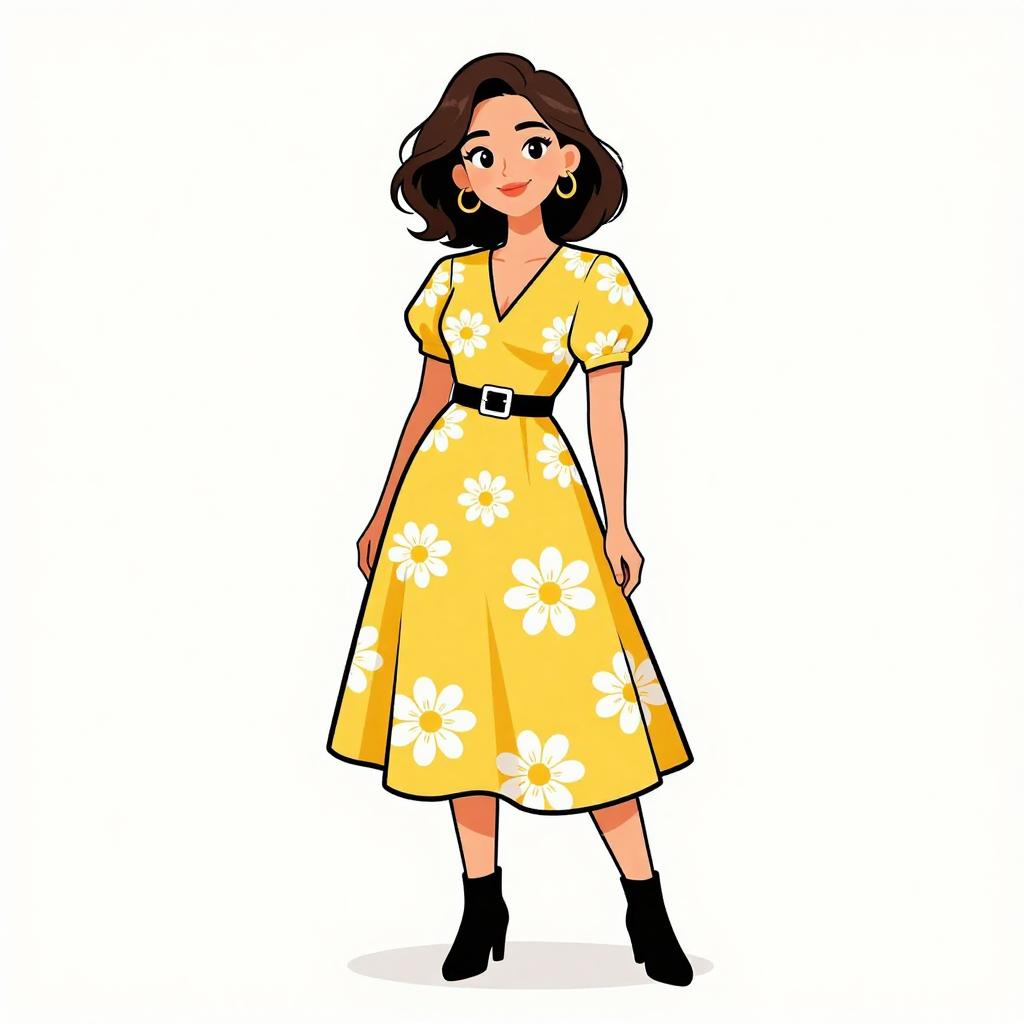 Woman with pretty face and pretty hair. smiling Woman, vintage-inspired, yellow printed midi dress with white floral motifs, short sleeves with subtle puff, v-neckline, cinched waist with black belt and silver buckle, A-line skirt, black ankle boots, white background. --sref 1467