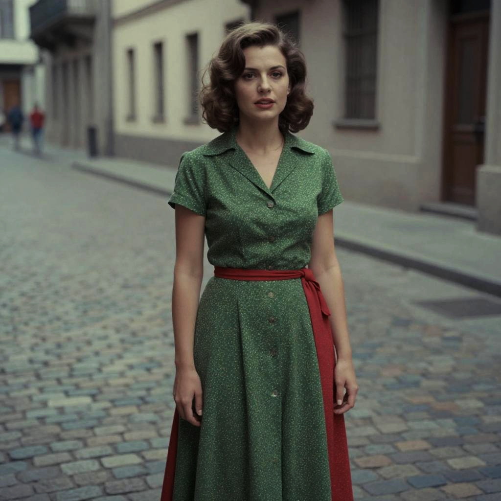 Ethnic Photoshoot, a woman in a green and red dress standing on a cobblestone street --sref 1438