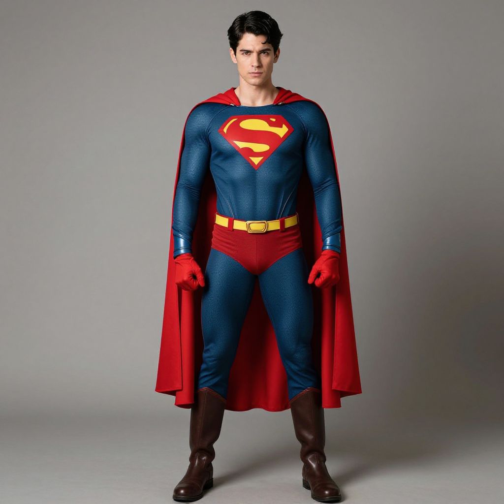 "super man costume, 1boy, male focus, solo, cape, red cape, full body, superhero, black hair, standing, pants, gloves, realistic, western comics (style), boots, brown footwear, belt Realistic photo of casual sexy person with pretty face"