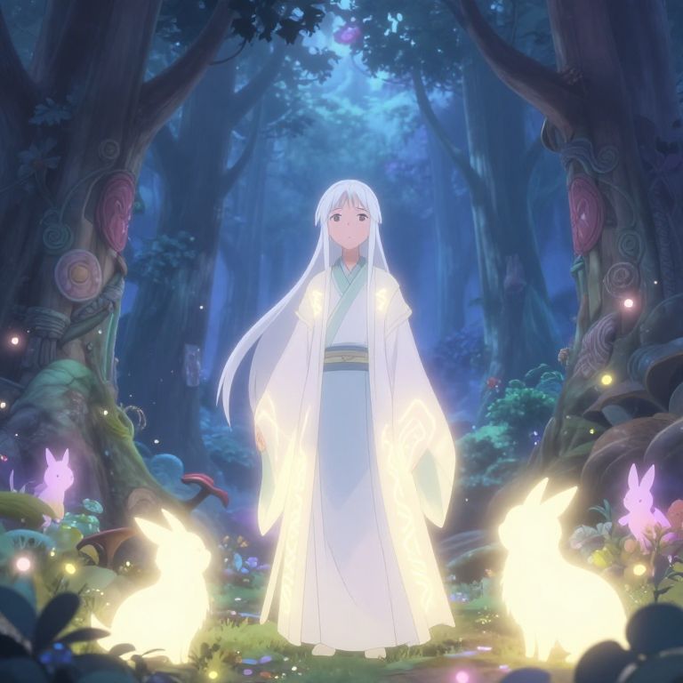 Anime:fmlevwqrzmc= mystical forest setting, enchanted creatures glowing softly in twilight, character wearing traditional fantasy robes with glowing runes, ethereal atmosphere with floating particles, intricate background details, soft pastel colors