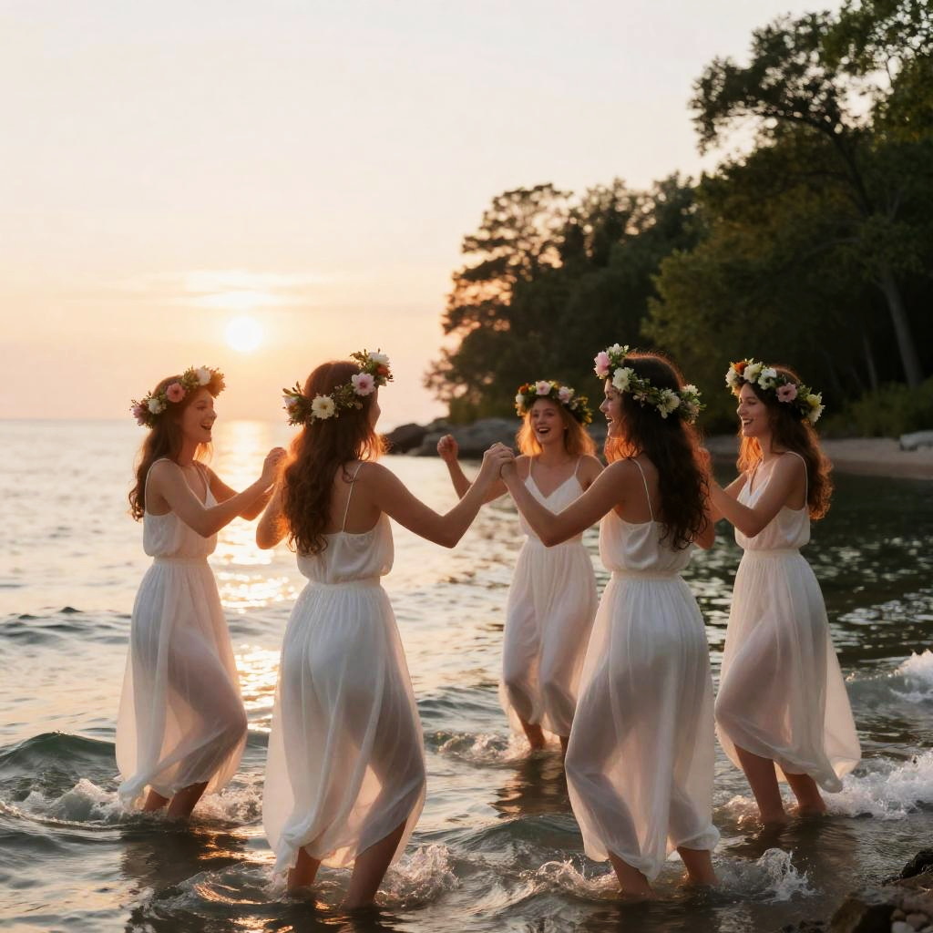 Realistic photo.Frank Martin Photo, hyper-realistic, real, detailed, 4 girls, flower crowns, white clothes, Lake Huron, warm tones, Nikon, 50 1.8 lens, romantic, fantasy, midsummer, singing, dancing in a circle, sunset, sun behind, green trees, standing in the water, joyous expressions, magical, contemporary white dresses, silky dresses, full-body photos realistic photo