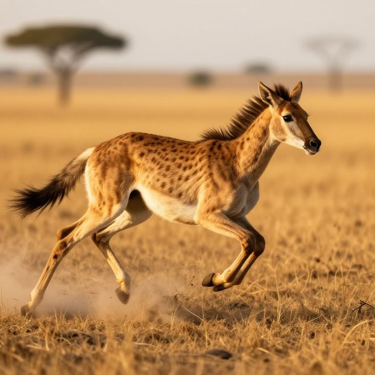 Photograph of a young, spotted hyena running across a golden, sunlit savanna with blurred acacia trees in the background. Dust kicks up