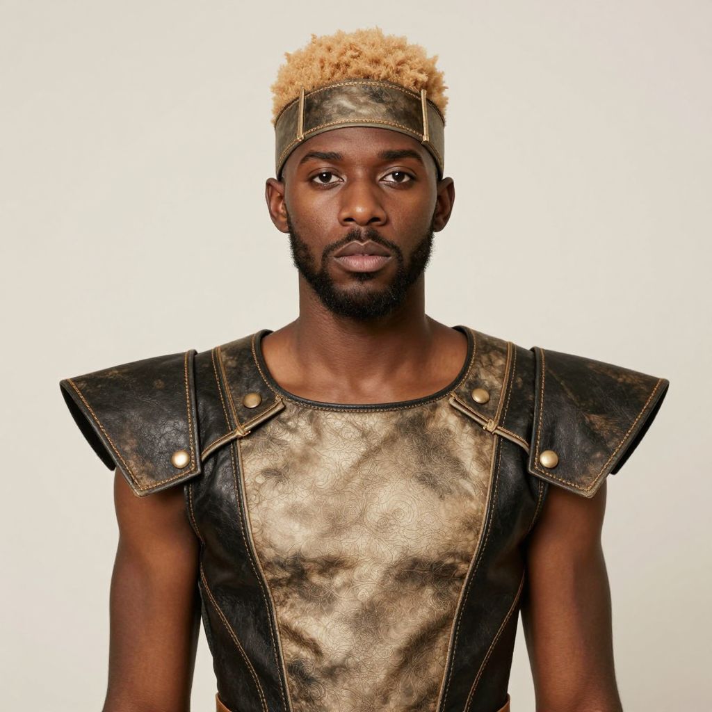 Photograph of a young Black man with a dark complexion and muscular build, standing against a plain white background. He has short, curly, bleached blonde hair and a neatly trimmed beard. He wears a metallic bronze, sleeveless top with black leather shoulder pads adorned with gold buttons. A black leather headband with gold accents rests on his forehead. His expression is neutral, with a direct gaze at the camera. The lighting is bright and even, highlighting the texture and shine of his outfit. The overall style is modern and edgy.