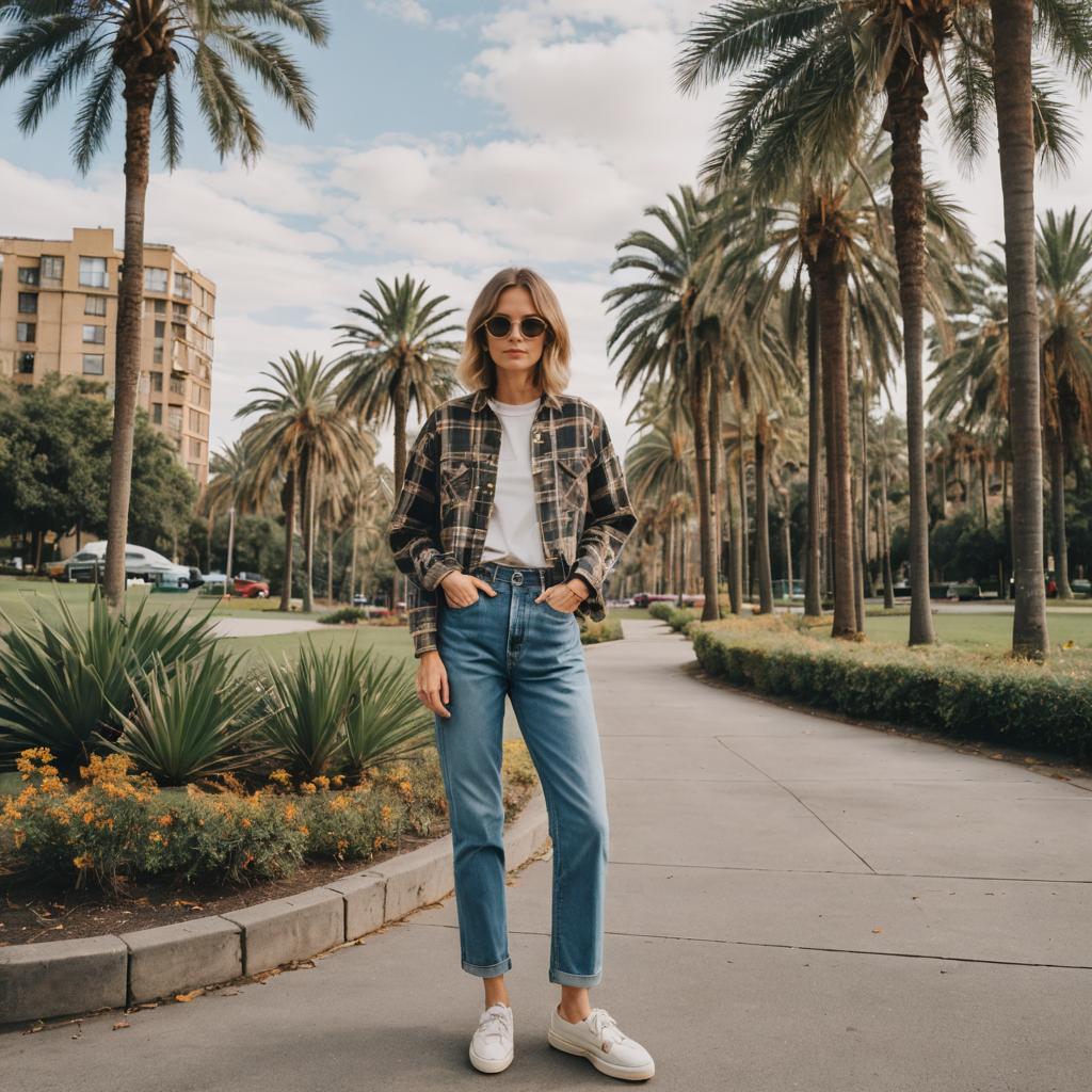 Slim woman with an A-line bob hairstyle standing in a palm tree park, dressed in a 1990s-inspired casual outfit. She wears an oversized plaid denim jacket over a graphic white t-shirt, paired with baggy skinny denim jeans in ochre tones. The look is completed by ochre leather espadrilles, evoking a vintage, grunge style with muted colors and retro fashion elements.