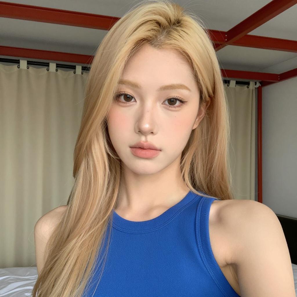 Young woman with long blonde hair, pink baseball cap, pink and white striped shirt over beige ribbed top, white pants, holding iPhone with right hand, taking mirror selfie, neutral facial expression, white door background.