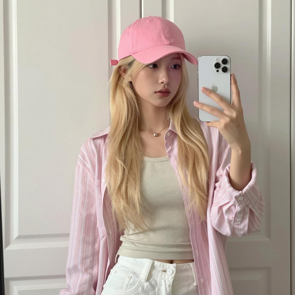 Young woman with long blonde hair wearing a pink baseball cap, pink and white striped button-up shirt over a beige ribbed tank top, and white pants. She is holding a silver iPhone with her right hand and taking a mirror selfie in front of a white door with a neutral facial expression.