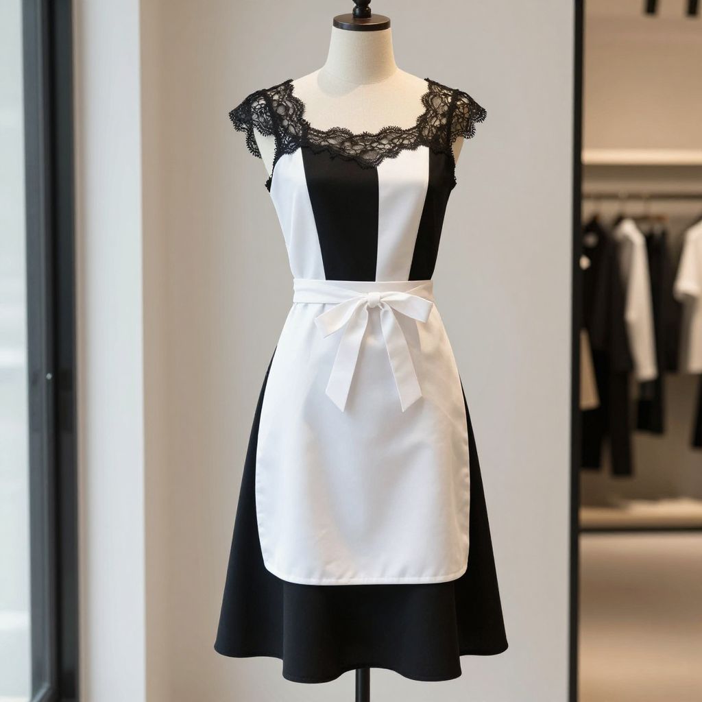 A mannequin standing upright in a modern, minimalist store setting, wearing a sophisticated black and white dress with elegant lines and a delicate lace detail, paired with a white apron that adds a playful yet stylish touch, the dress features a structured bodice and flowing skirt, the apron is neatly tied at the waist with a subtle bow, soft natural light illuminates the scene, highlighting the contrast between the sleek black and white ensemble and the bright white apron, giving a blend of classic fashion and whimsical charm.
