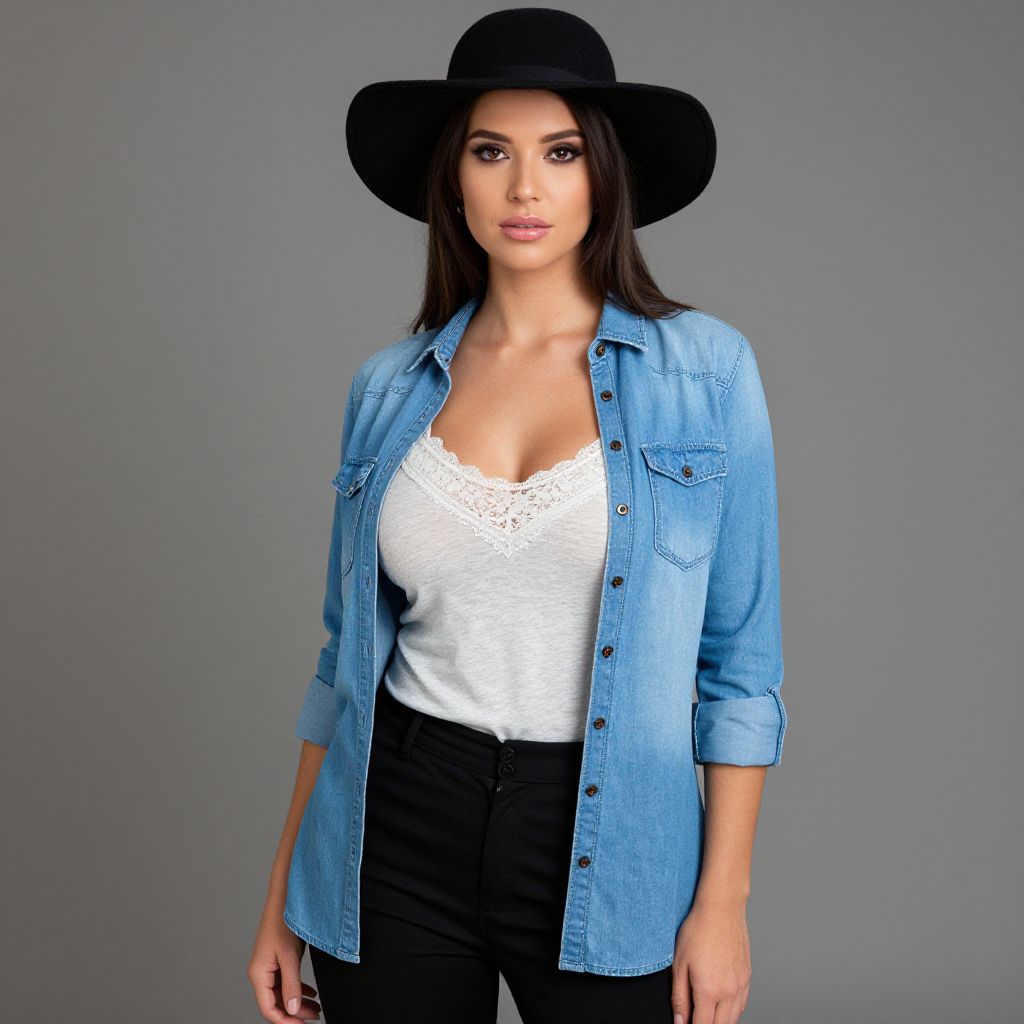 Photograph of a young woman with fair skin and long dark brown hair, wearing a black wide-brimmed hat, light blue denim shirt with rolled-up sleeves, white lace-trimmed tank top, and black pants. She has a neutral expression and stands against a plain gray background. Her shirt features two chest pockets and black buttons. The denim shirt's texture contrasts with the smooth fabric of her tank top and the slightly shiny texture of her pants. The overall style is casual yet stylish.