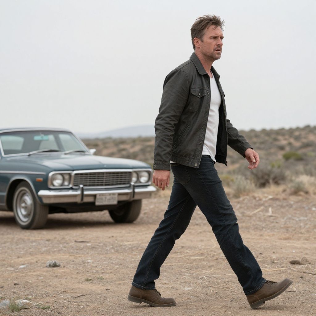 A man strides forward with determination in an outdoor setting, hinting at a suspenseful moment in a movie scene, with a rugged landscape and a vintage car in the background, evoking an artistic and cinematic atmosphere.
