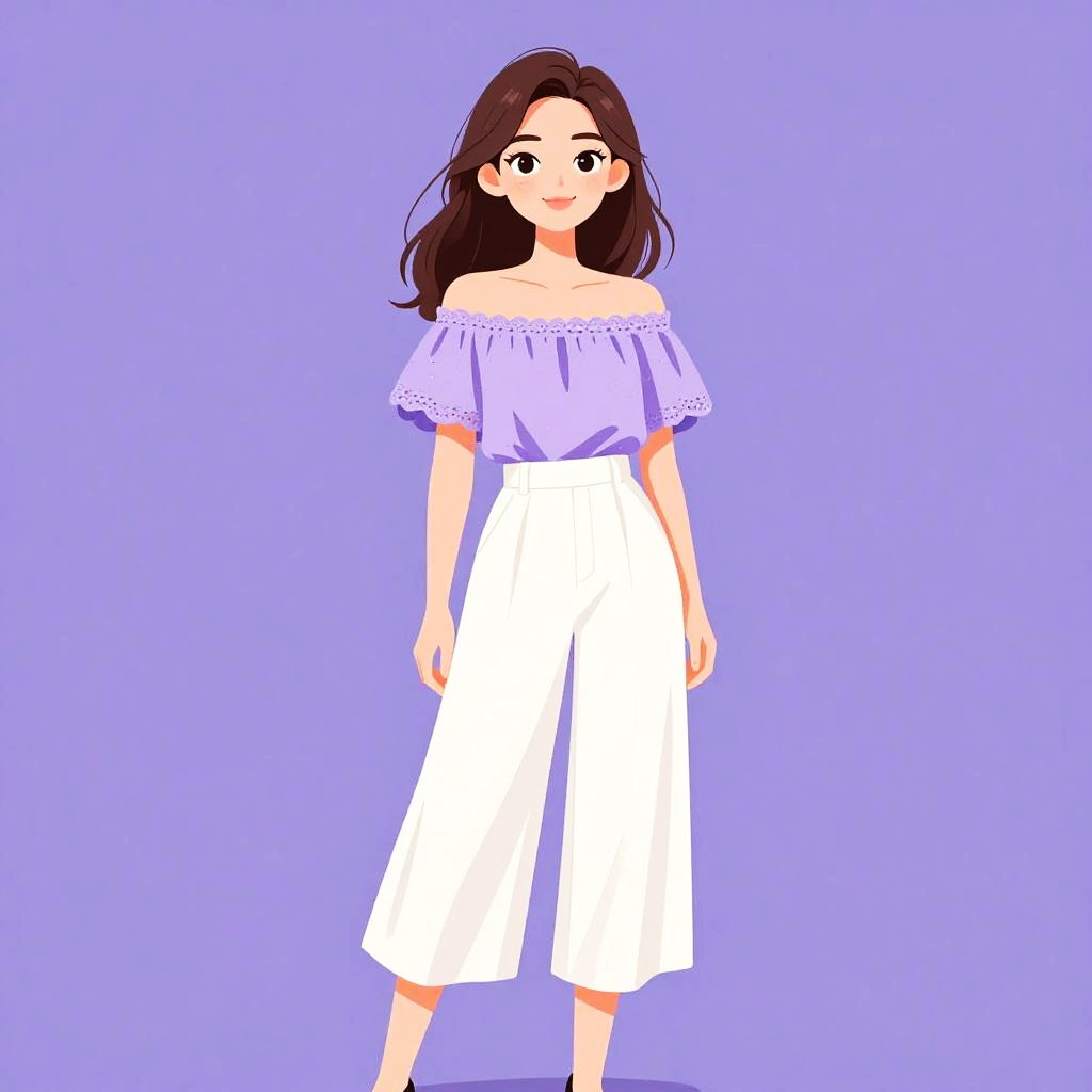 Woman with pretty face and pretty hair. Off-the-shoulder top, lightweight cotton, soft lavender, delicate lace trim, high-waisted culottes, flowy linen, crisp white, wide-leg silhouette, subtle pleats, casual elegance. --sref 1461