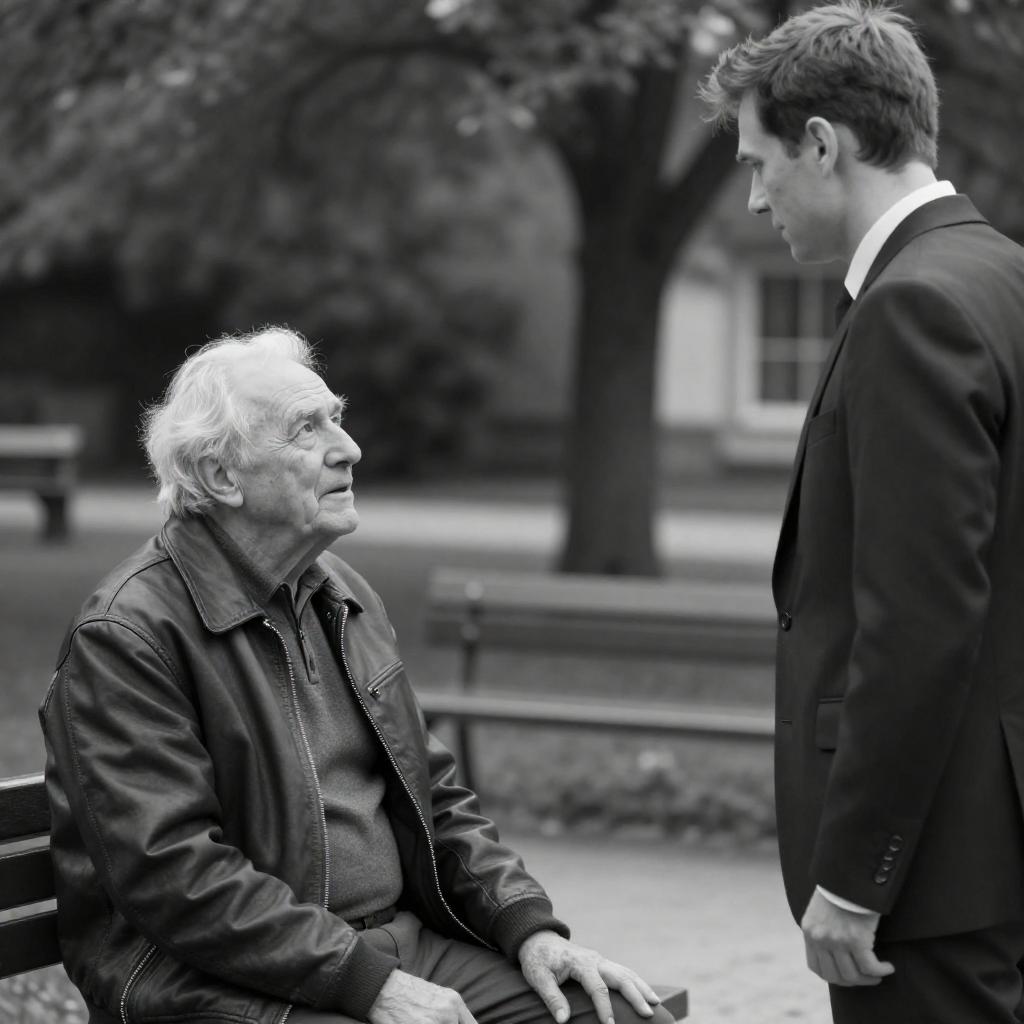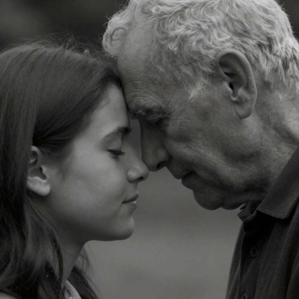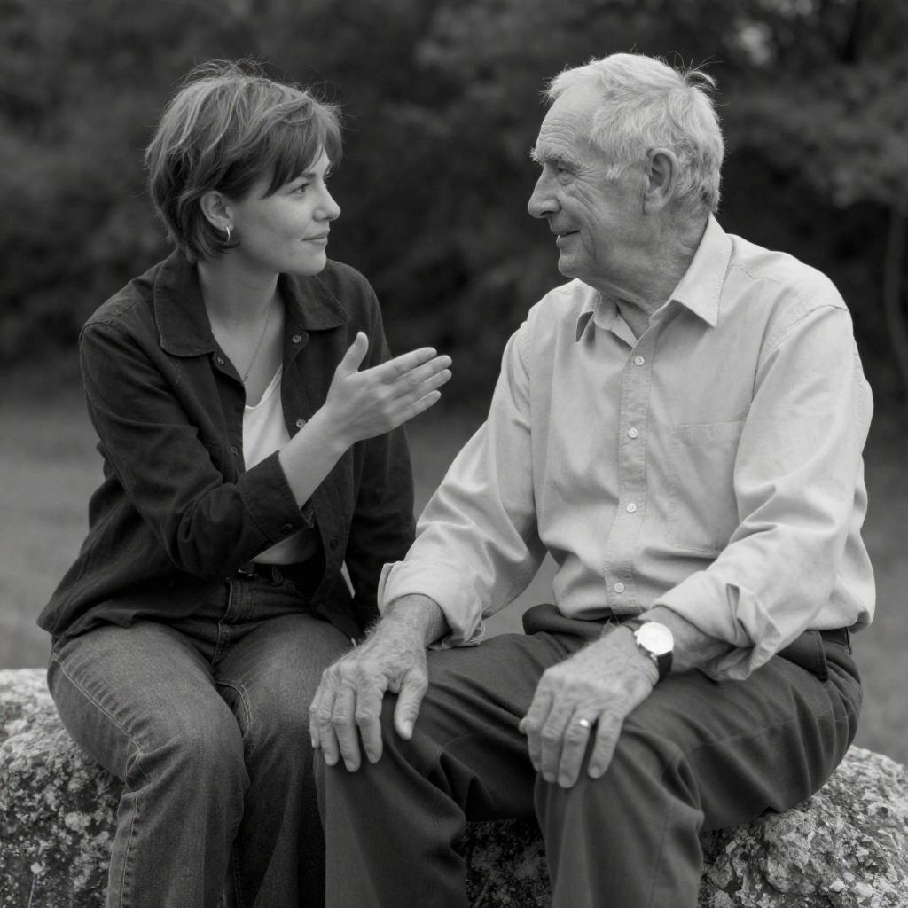 Black-and-white photograph of an elderly white man with gray hair, wearing a light shirt and dark pants, sitting on a rock beside a young white woman with short hair, wearing a dark jacket and jeans. They are outdoors, with trees in the background. The woman is gesturing with her right hand while looking at the man, who is smiling and looking at her.
