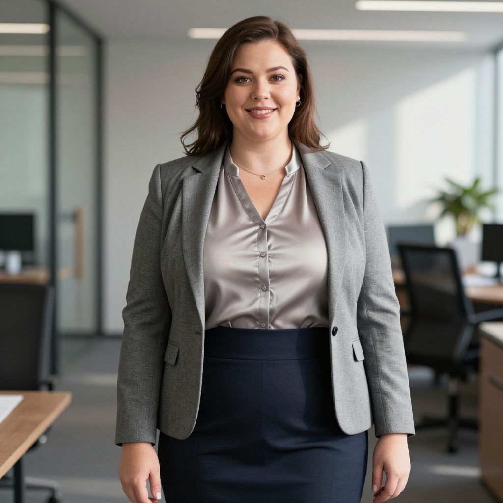 A confident plus size office wear woman in her late 30s with warm brown eyes and a friendly smile stands in a modern, well-lit corporate office, wearing a stylish, tailored blazer with a pencil skirt and silk blouse — the outfit is professional yet comfortable, blending fashion with functionality, with soft natural light casting gentle shadows on her face and shoulders.. The woman has big tits and cute face