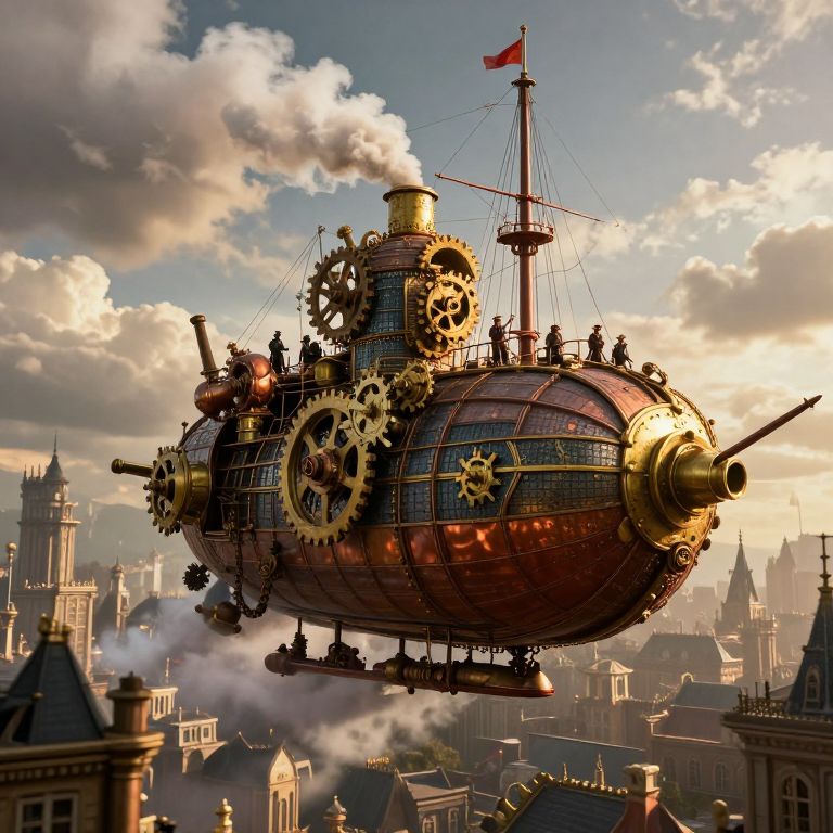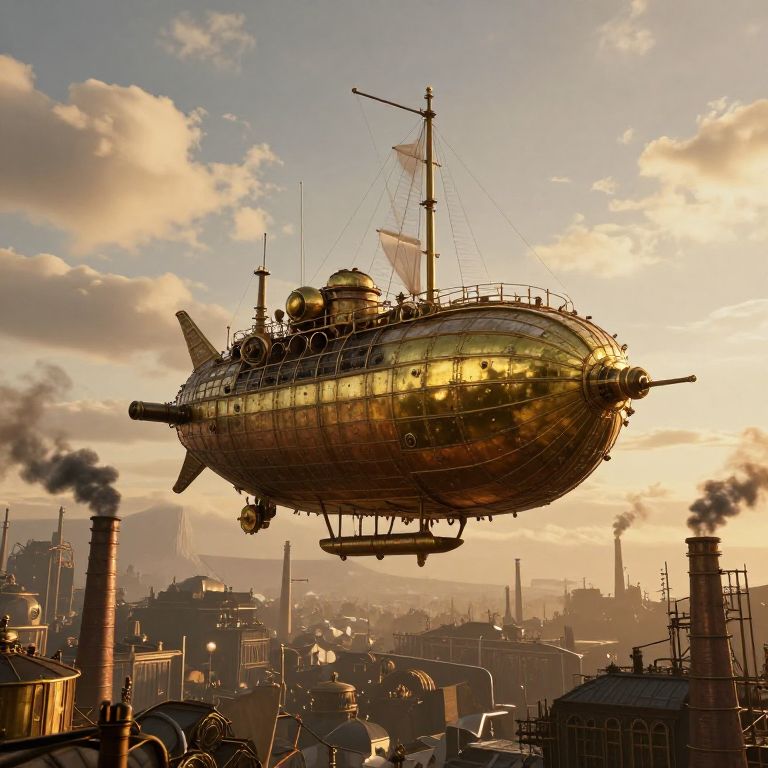 Halford, a steampunk-inspired airship docked at a bustling skyport, intricate machinery and brass gears visible, steam billowing from engines, diverse crowd of adventurers preparing for departure, sunset casting warm golden hues over the scene, highly detailed environment