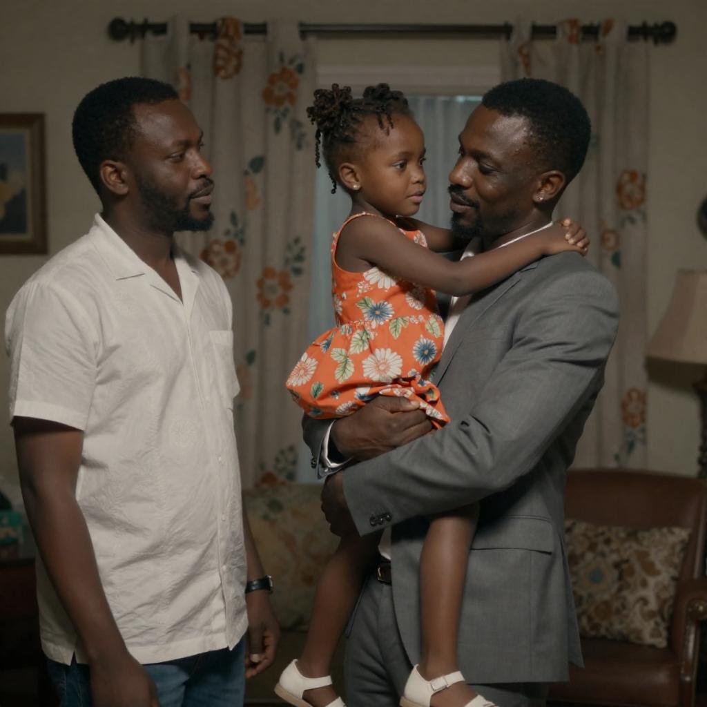 Photograph of three African-American people in a dimly lit room. A man in a gray suit holds a young girl with an orange floral dress, who is hugging his neck. Another man in a white floral shirt stands to the left, looking at them. Floral curtains and furniture are in the background.