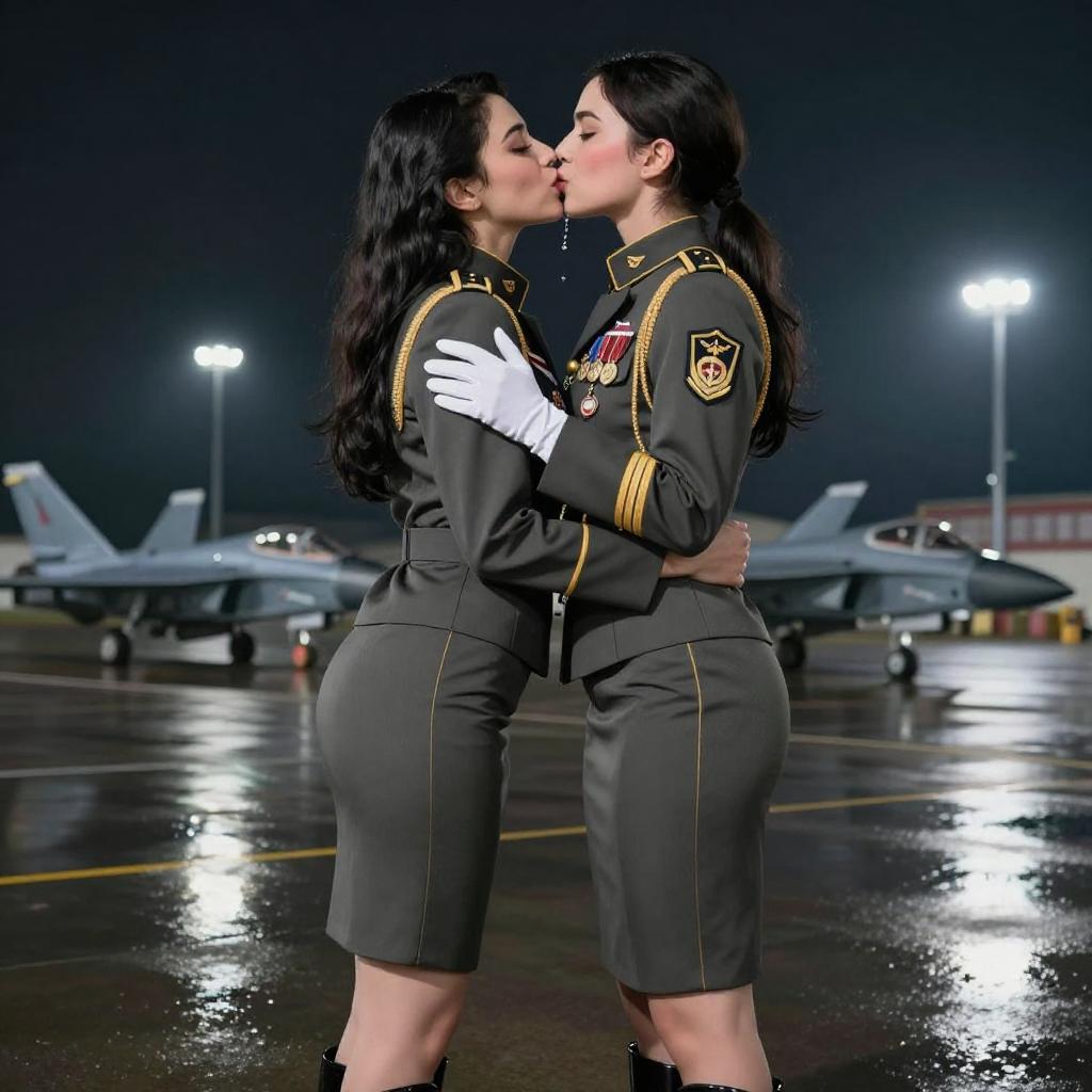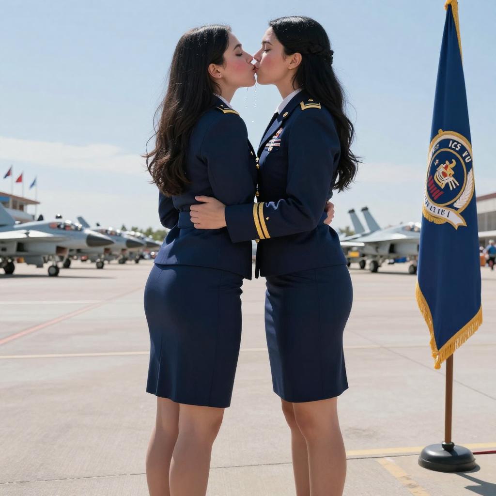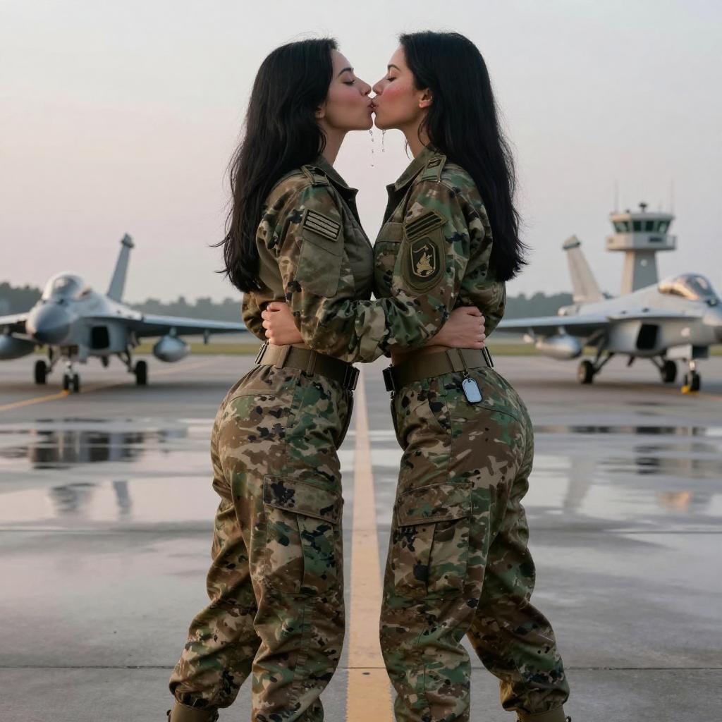 Two Women in Military Jumpsuits Kissing on Airbase