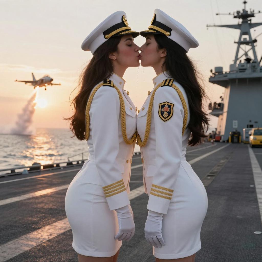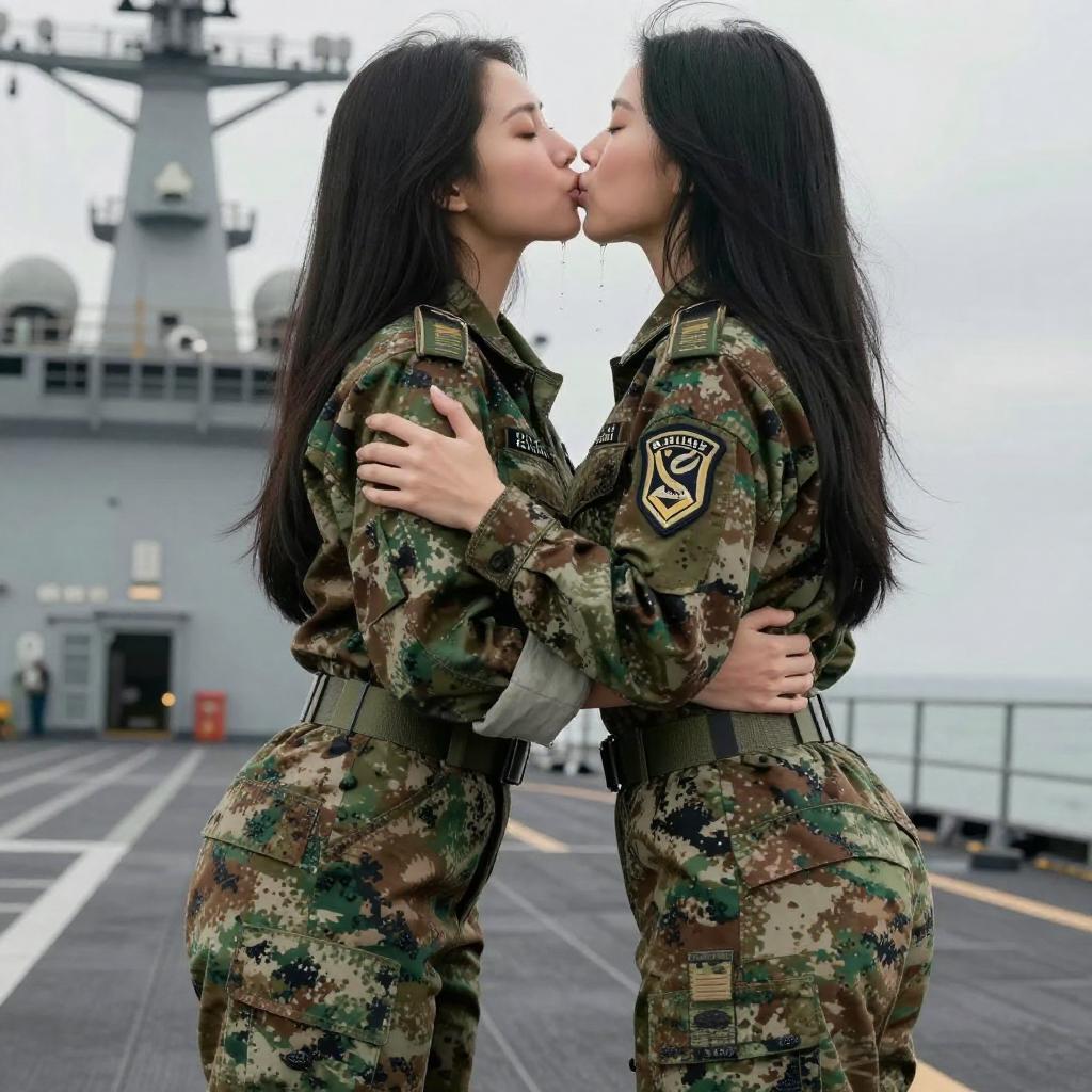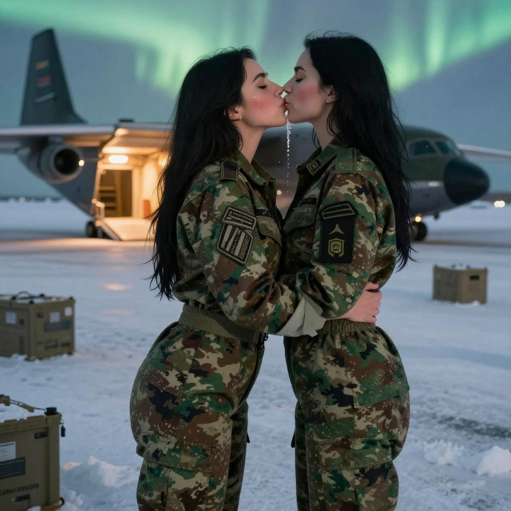 Two Women in Military Jumpsuits Kissing on Airbase