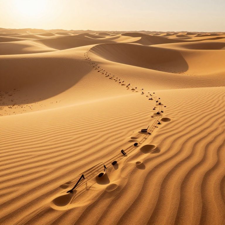 A mesmerizing 3D-rendered desert landscape bathed in golden-hour sunlight, featuring undulating sand dunes textured with intricate patterns resembling tiny musical notes, evoking an ethereal ambiance as if each step could trigger harmonious melodies.