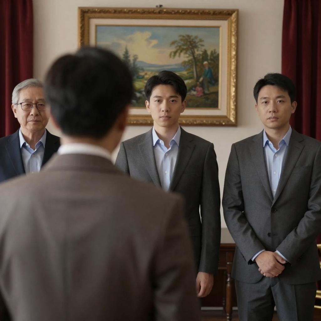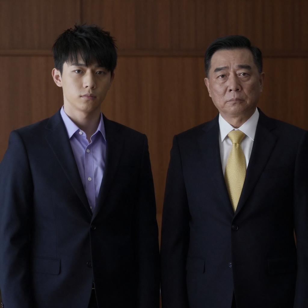 Photograph of two men in a dimly lit room. Both wear dark suits and badges. Young man on left with black hair, slightly disheveled, wearing a purple shirt. Older man on right with short black hair, yellow tie, serious expression. Wood-paneled background.