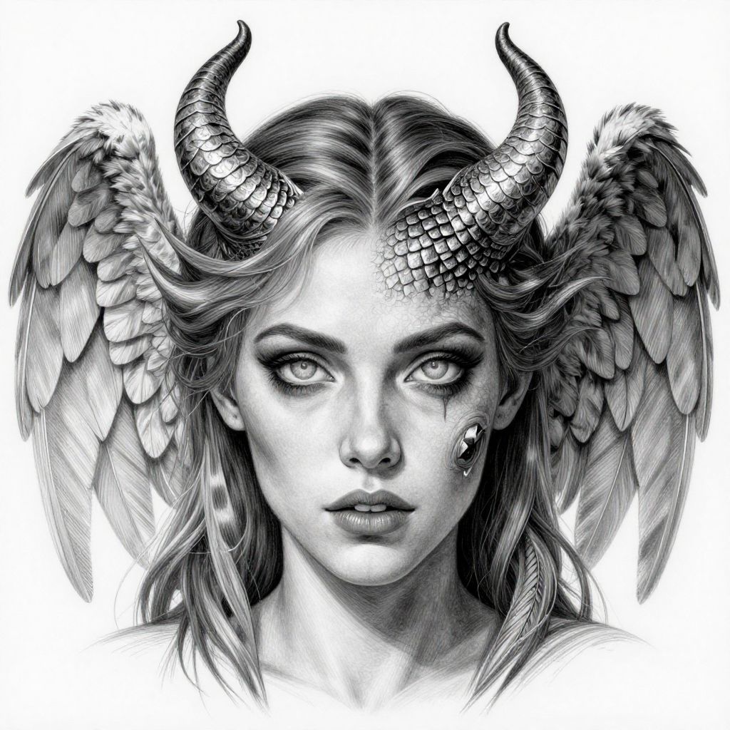 Half angel half demon face drawing, surreal blend showing the duality of good and evil on a human face, angelic wing feathers fading into demonic scales, expressive eyes glowing contrastingly, fantasy character design, highly detailed shading