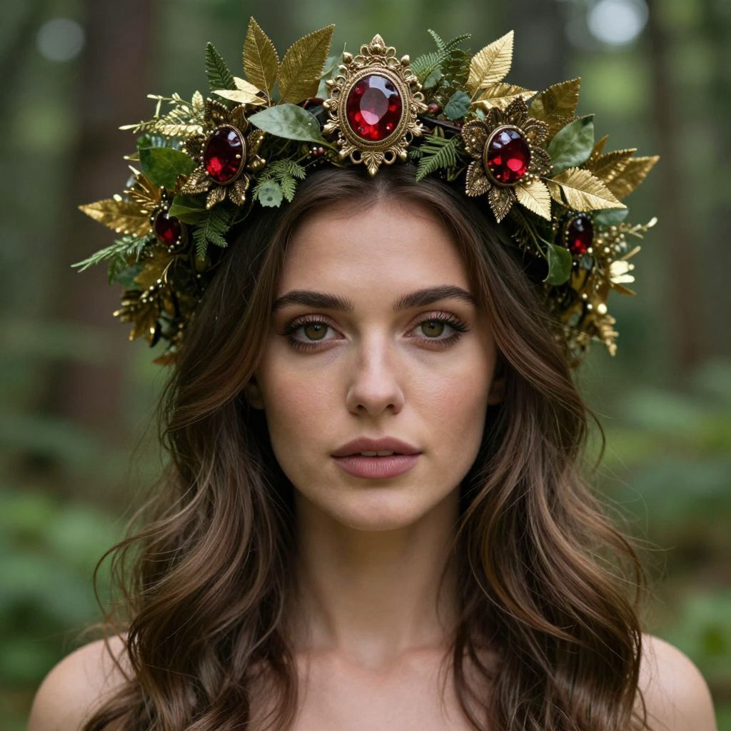 Radiant woman adorned with a verdant forest crown featuring golden leaves, red gemstones, and intricate floral details, set against a lush green woodland backdrop.