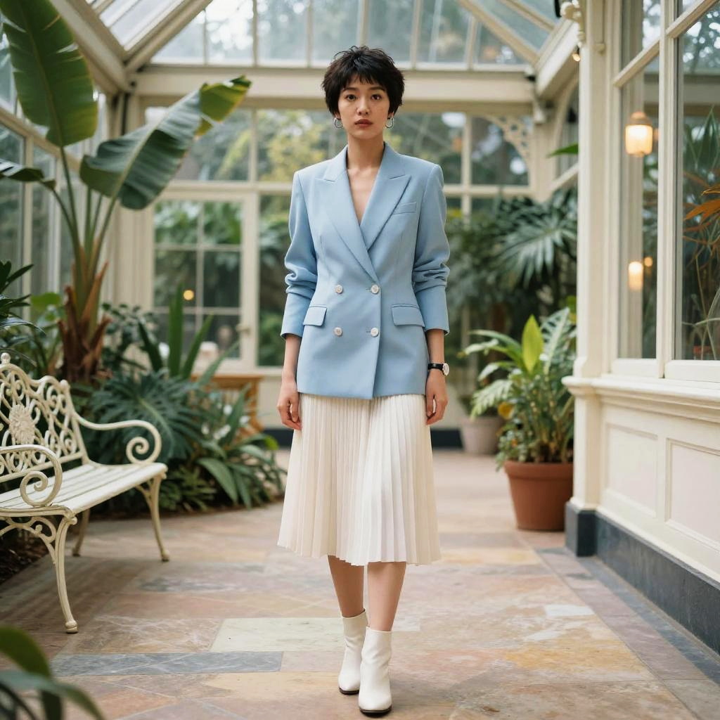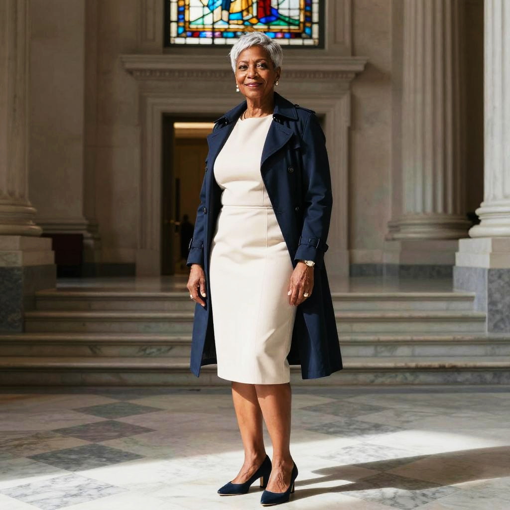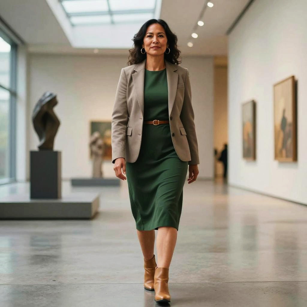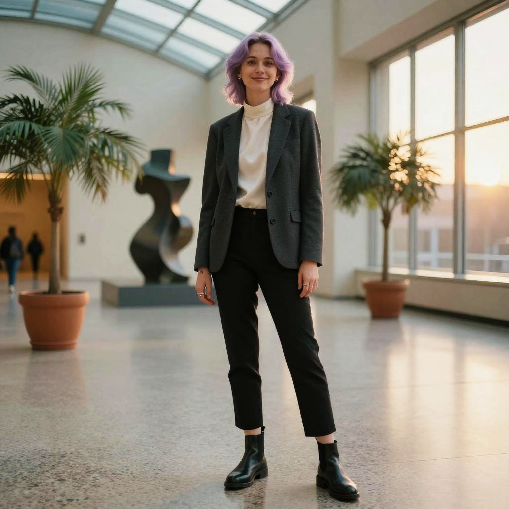 Confident mid-30s trans South Asian woman with long dark ombre waves swept over one shoulder, subtle winged eyeliner, warm engaging smile, poised full-body posture, powder-blue tailored double-breasted pantsuit over an ivory silk camisole, nude pointed-toe kitten heels, slim tan leather belt, thin silver lariat necklace and small stud earrings, cozy sunlit library with tall wooden bookshelves and vintage reading lamps; looking at viewer, full body, natural makeup, minimal jewelry, elegant posture, environmental portrait, soft window glow, rim light accents, shallow depth of field, 85mm lens perspective, realistic skin texture, subtle film grain, cinematic color grading, crisp details, clean background, (photorealistic:1.3), (8k, RAW photo:1.2), (best quality, masterpiece, ultra high res, absurdres), chromatic aberration:1.05