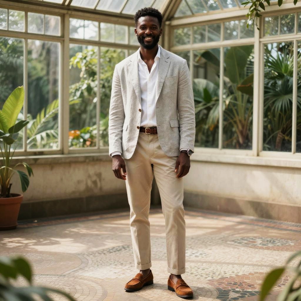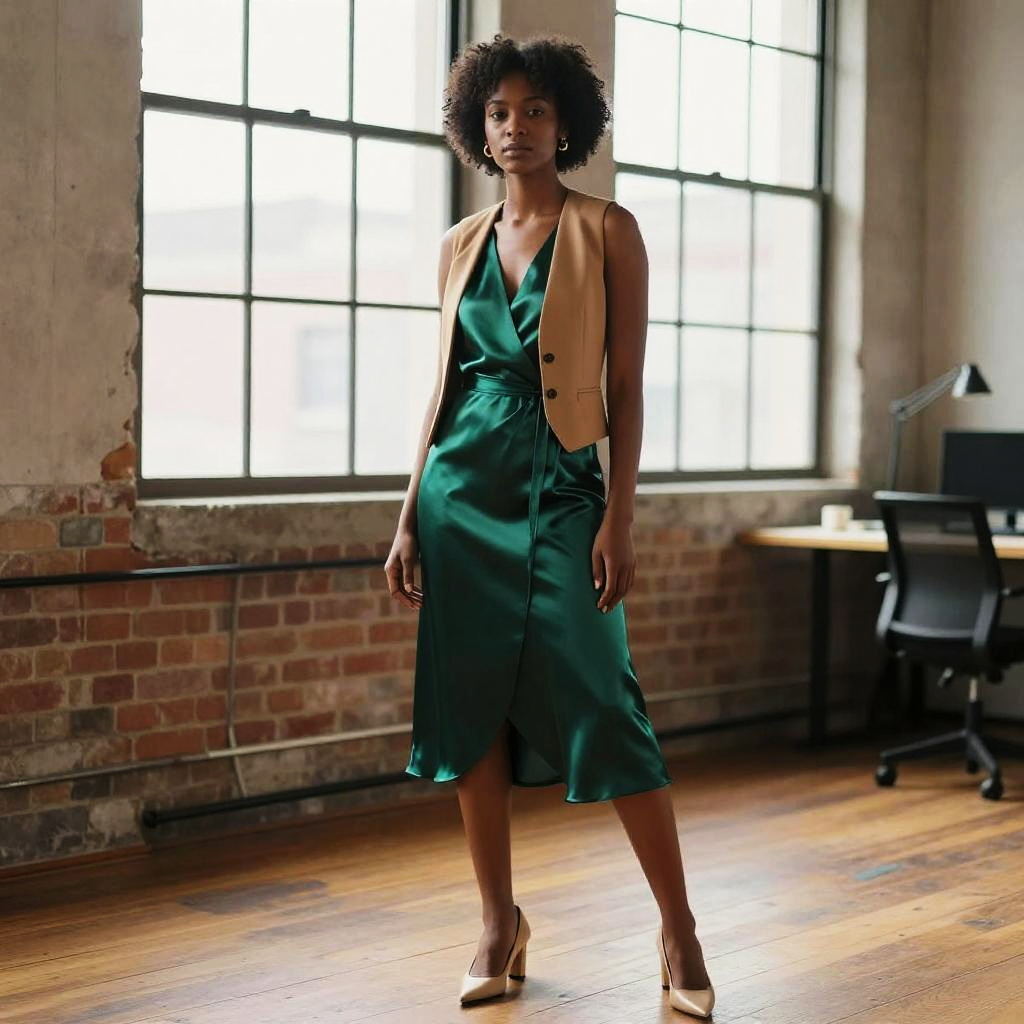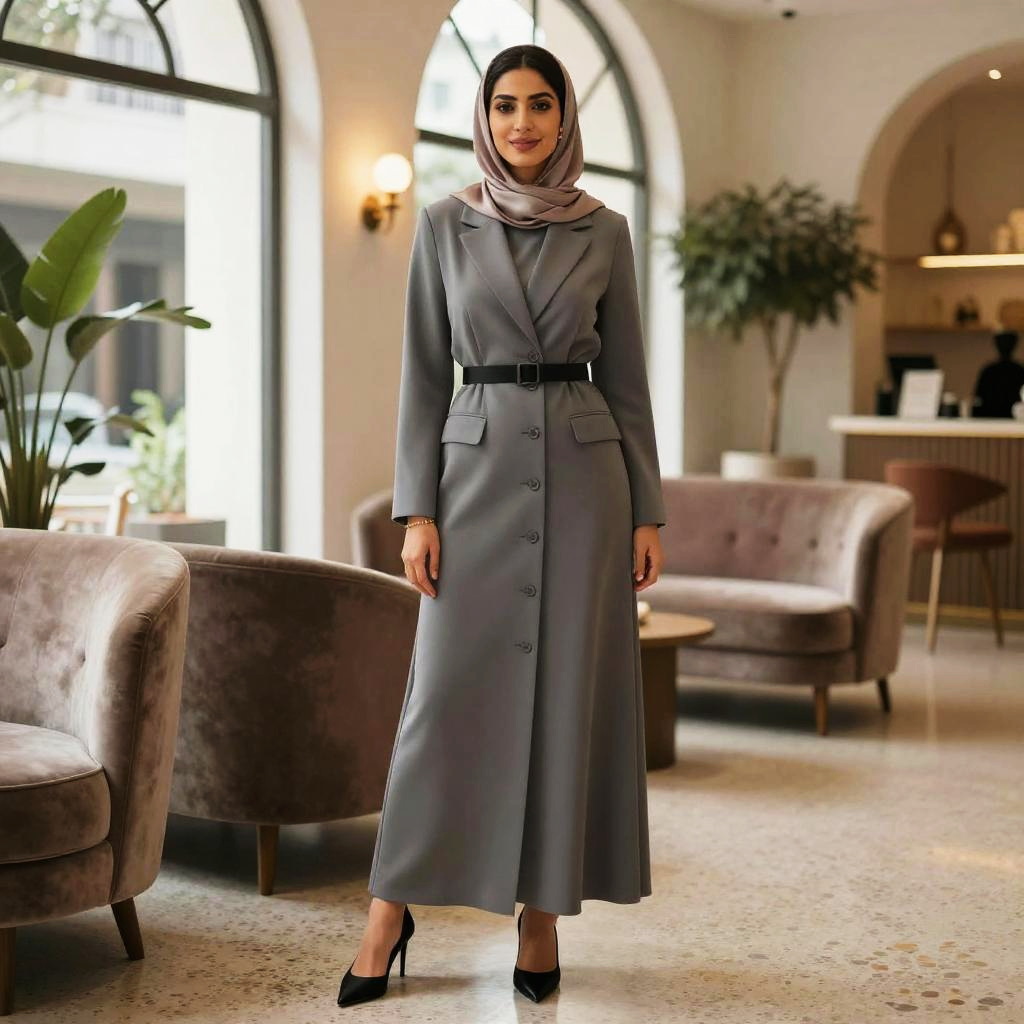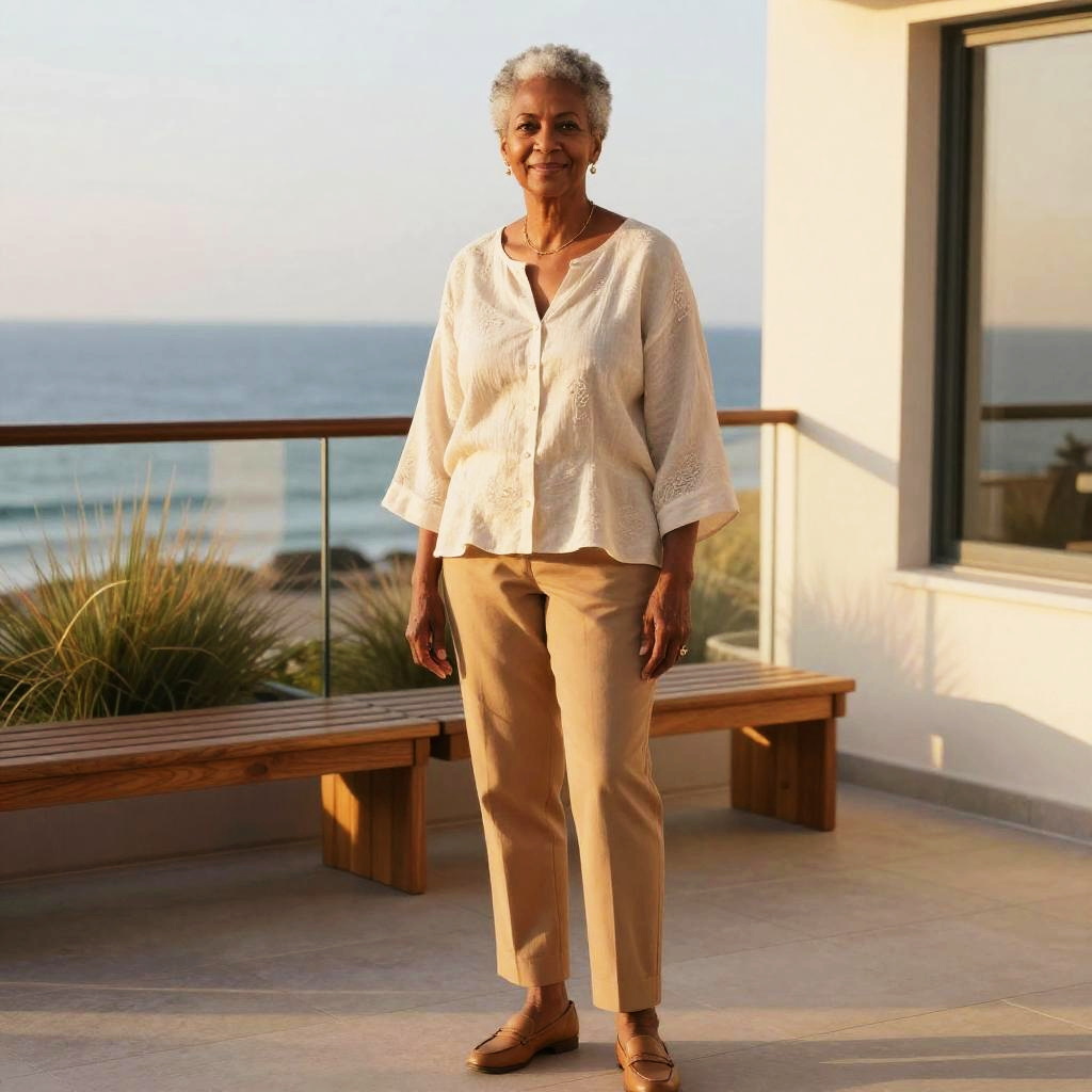 Confident mid-30s trans South Asian woman with long dark ombre waves swept over one shoulder, subtle winged eyeliner, warm engaging smile, poised full-body posture, powder-blue tailored double-breasted pantsuit over an ivory silk camisole, nude pointed-toe kitten heels, slim tan leather belt, thin silver lariat necklace and small stud earrings, cozy sunlit library with tall wooden bookshelves and vintage reading lamps; looking at viewer, full body, natural makeup, minimal jewelry, elegant posture, environmental portrait, soft window glow, rim light accents, shallow depth of field, 85mm lens perspective, realistic skin texture, subtle film grain, cinematic color grading, crisp details, clean background, (photorealistic:1.3), (8k, RAW photo:1.2), (best quality, masterpiece, ultra high res, absurdres), chromatic aberration:1.05