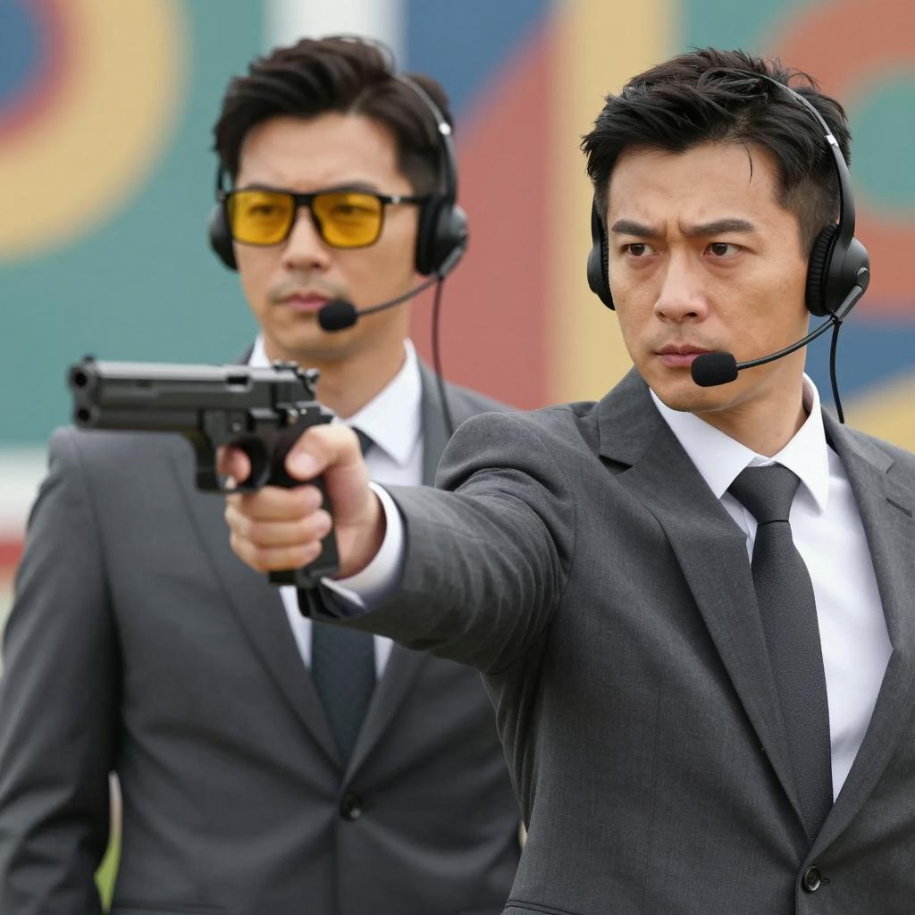Two Asian men wearing dark gray suits, white shirts, and black ties stand in front of a colorful blurred background. Both men wear black headset microphones; the man in the foreground aims a black handgun forward with a focused expression, while the man in the background wears yellow-tinted glasses and maintains a neutral expression.
