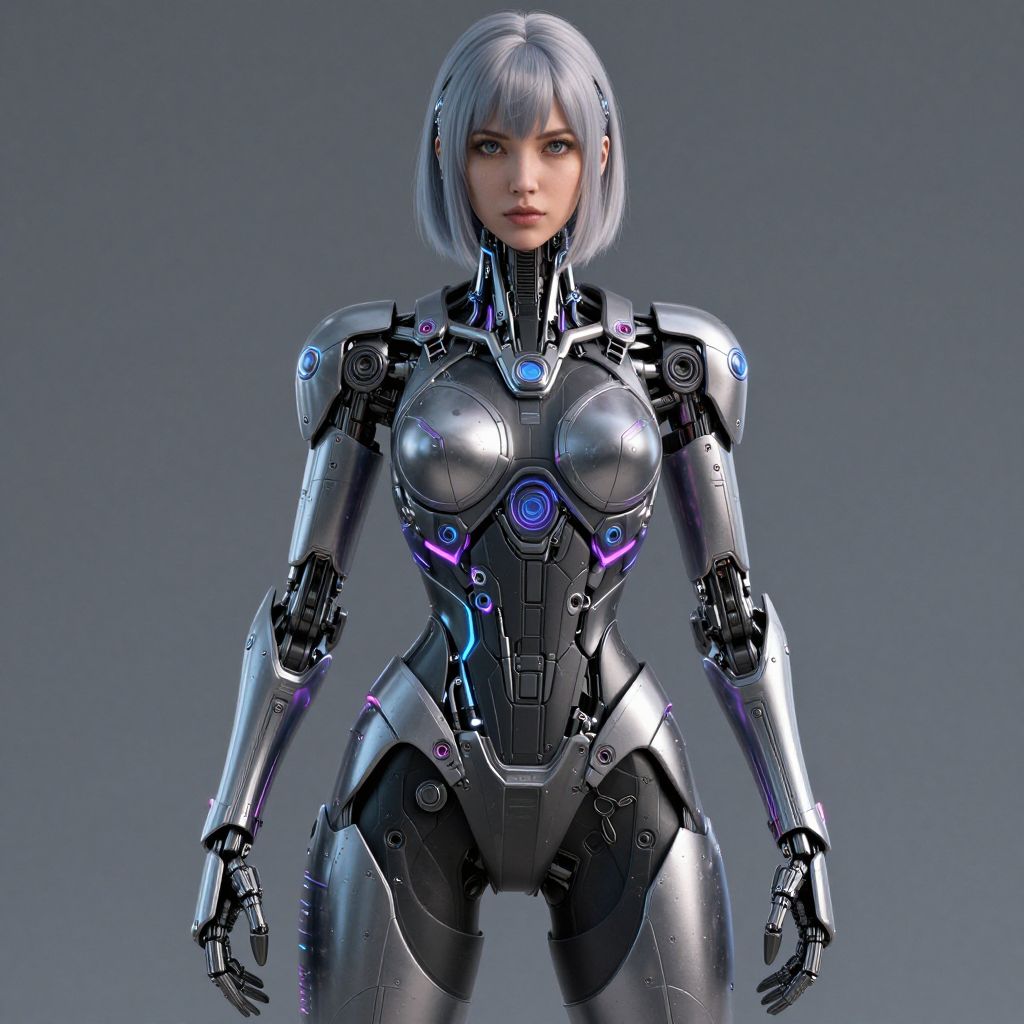 A futuristic, half-robotic warrior woman with neon accents and intricate mechanical details.