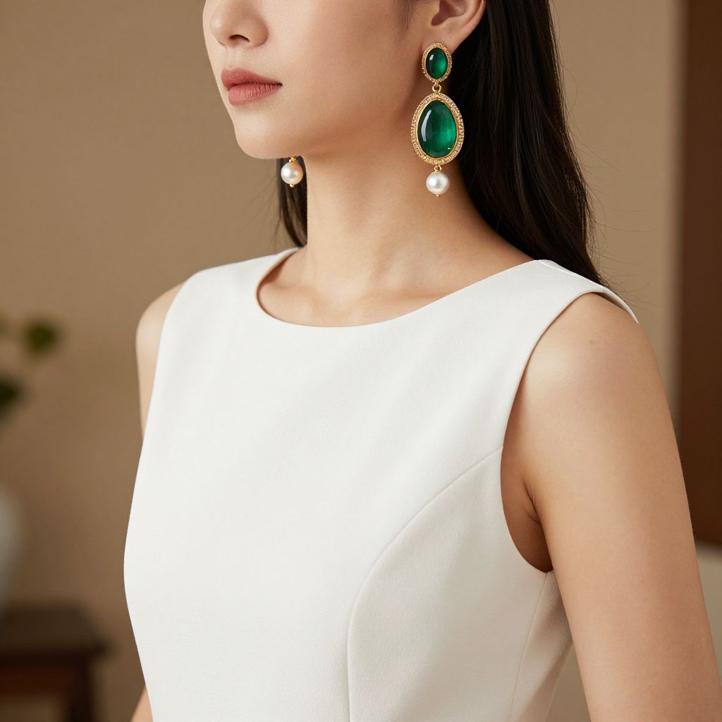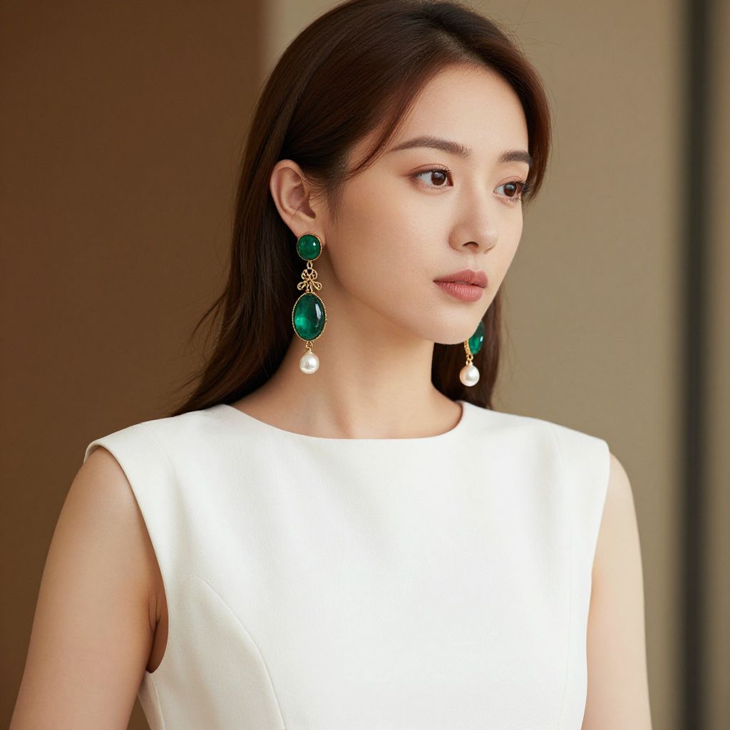 Photograph of an Asian woman with long black hair, wearing a sleeveless, white, form-fitting dress. Her face is partially visible, showing pink lips. She is adorned with large, elegant green and gold oval-shaped earrings with dangling white pearls. The background is blurred, featuring a neutral-toned wall and indistinct furniture. The lighting is soft, highlighting her smooth, fair skin and the dress's clean lines. The image focuses on her upper body and jewelry, emphasizing a sophisticated, minimalist style.