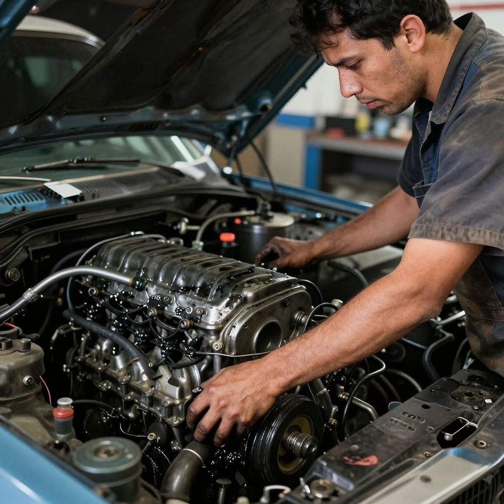 DEN_marissa_munoz, (working in a garage on a mustang car engine covered in oil and dirt wearing a dirty jumpsuit, mechanic, working on a car, engine:1.2), bokeh, f1.4, 40mm, photorealistic, raw, 8k, textured skin, skin pores