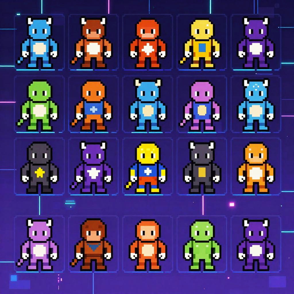 Sprite ai generator crafting pixel art heroes and monsters, retro pixel game aesthetic combined with modern AI technology, glowing data streams flowing through digital grids, detailed sprite animations, cyberpunk colors, nostalgic yet futuristic scene