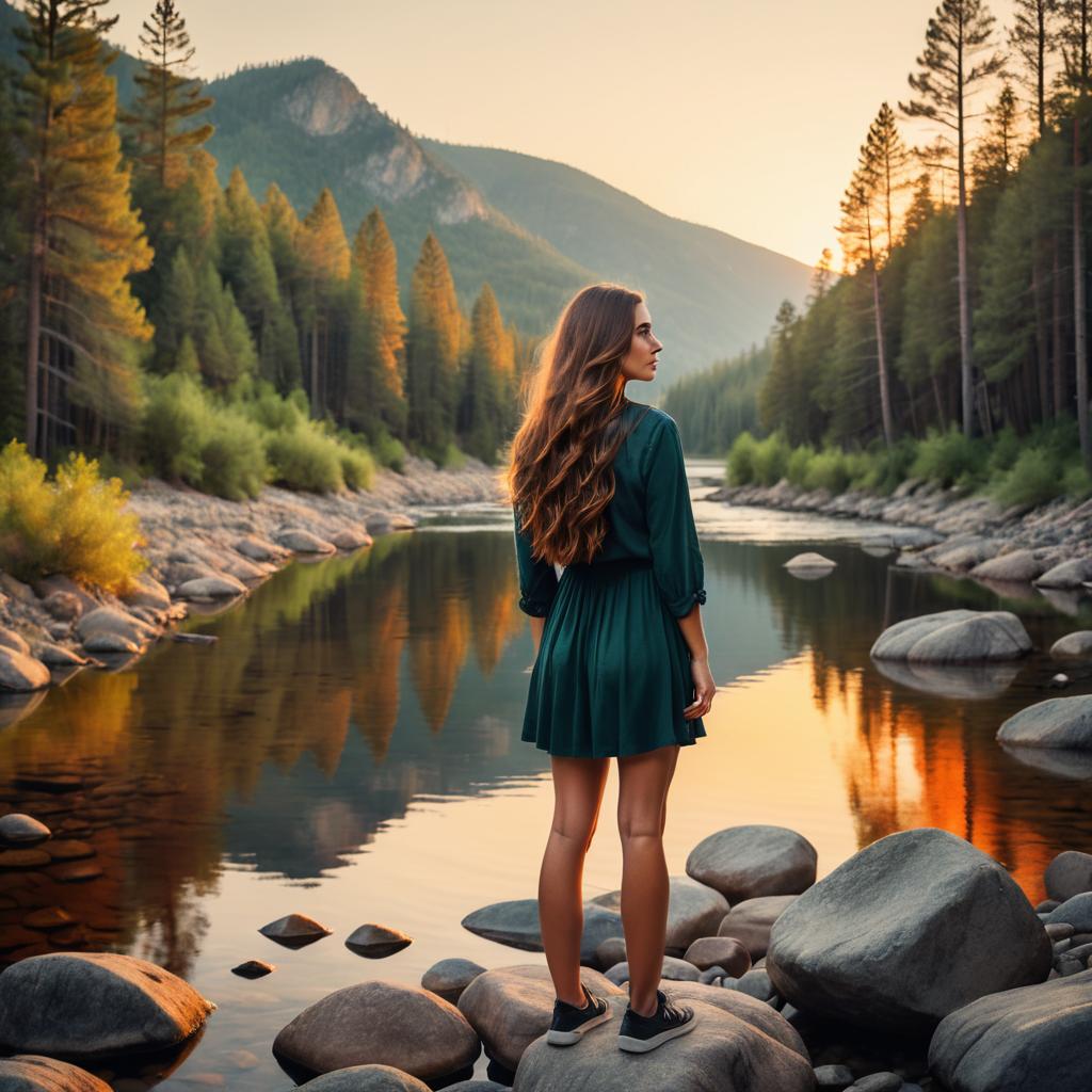 A young woman with long brown hair standing on a rocky riverbank, facing a calm river surrounded by dense pine trees and distant mountains under a warm orange sky during sunset, realistic and detailed nature scene with soft warm lighting illuminating the water and foliage