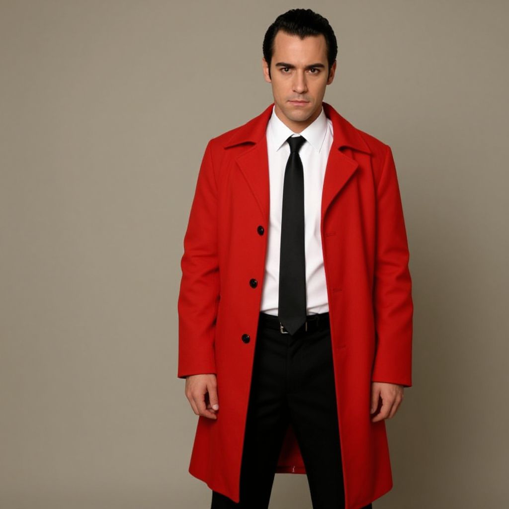 Photograph of a man with short black hair and a serious expression, standing against a plain gray background. He is wearing a bright red, long, double-breasted overcoat with black buttons, a white dress shirt, and a black tie. His black trousers are visible beneath the coat. The overcoat's vivid color contrasts sharply with his white shirt and black tie, creating a striking visual. The man's hands are relaxed by his sides, and his gaze is directed slightly to the right of the camera. The overall style is formal and elegant.