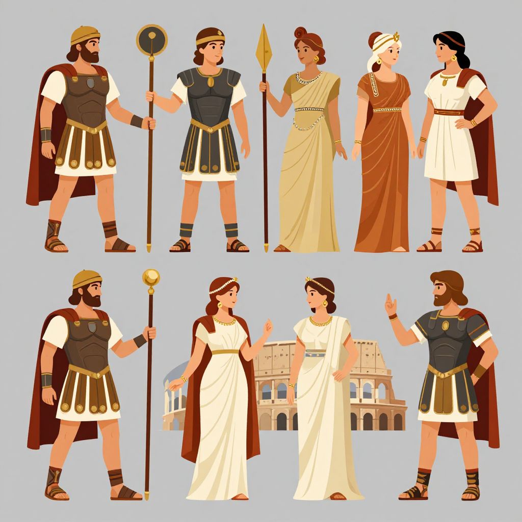 Digital illustration of six ancient Greek-style figures: three men in armor and tunics, three women in draped gowns, with a Colosseum