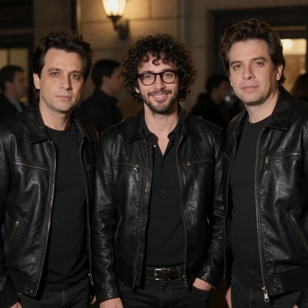 Photograph of three men in a dimly lit, urban setting. The central man with curly hair, glasses, and a black leather jacket smiles, flanked by two men with dark hair and leather jackets. Background includes blurred figures and warm lighting.