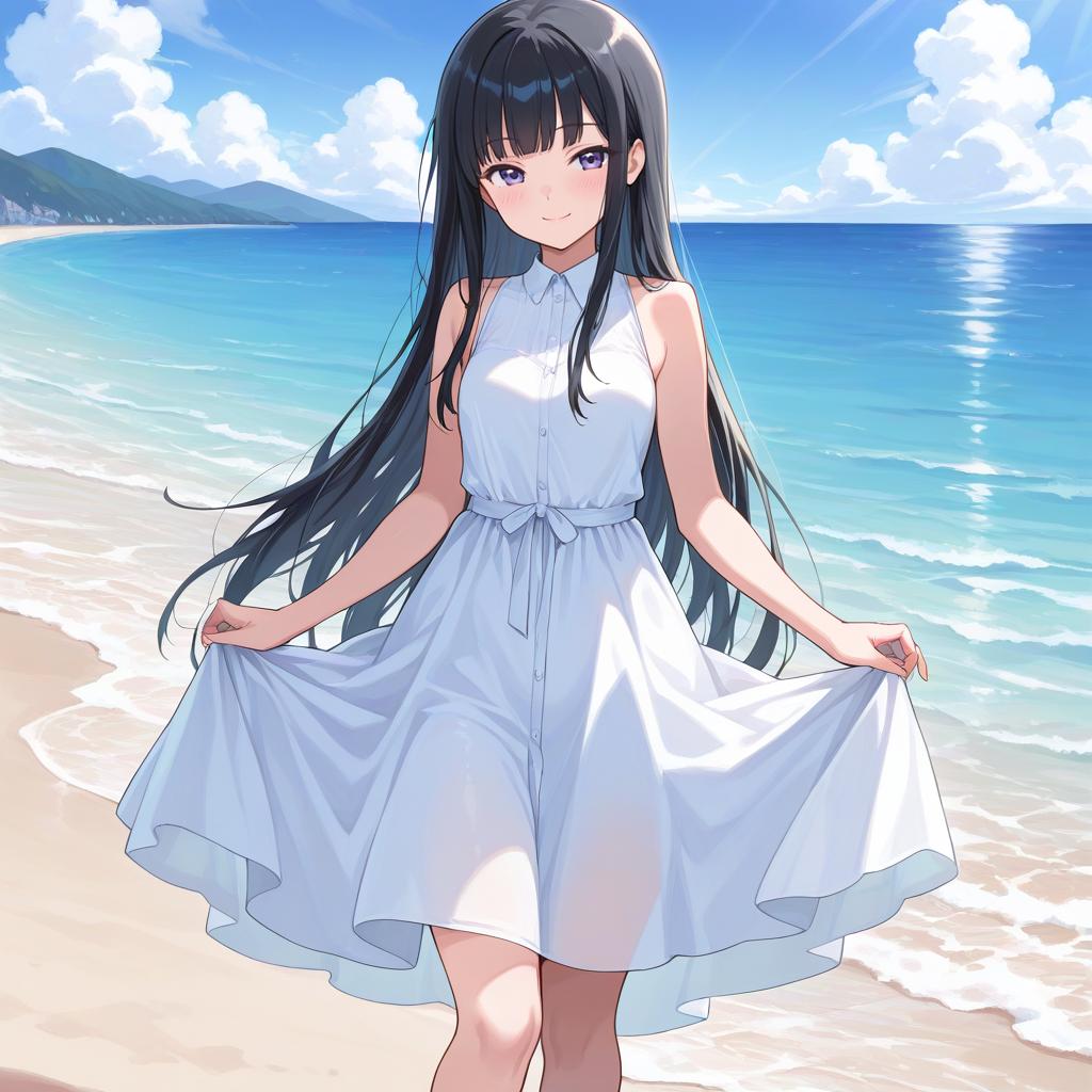 Digital anime-style illustration of a young girl with very long black hair and blunt bangs, wearing a sleeveless white sundress. She is standing on a sandy beach with clear blue ocean waves and a partly cloudy sky in the background. The girl has blue eyes, a gentle smile, and a slight blush on her cheeks. The scene is bright and airy, highlighting a peaceful day by the sea.