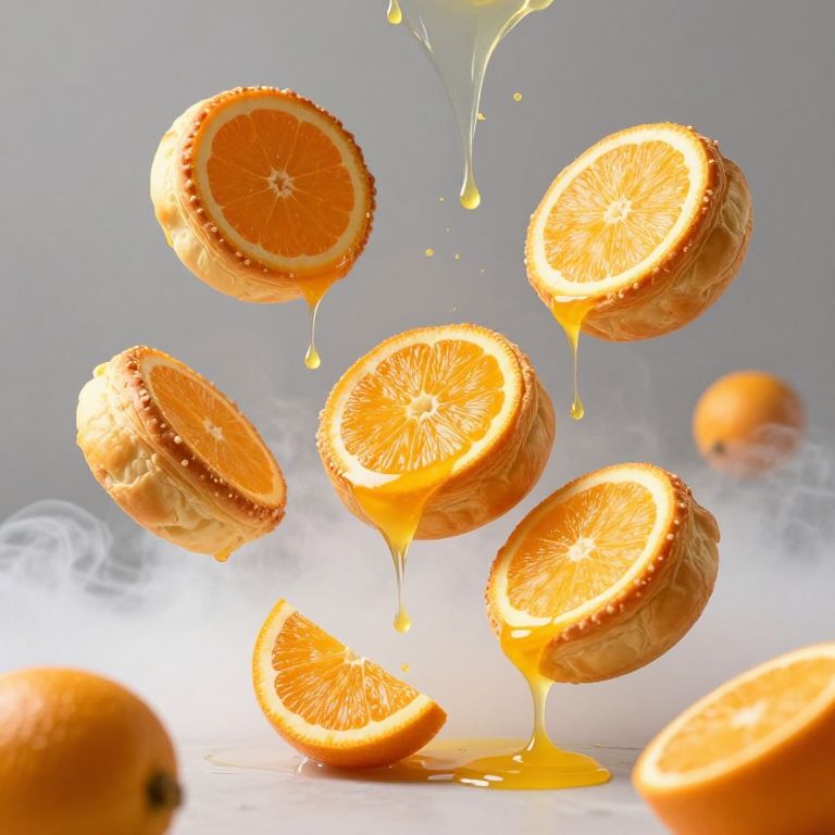Surreal pastries float in mid-air, their golden crusts cradling vibrant orange slices, while streams of smoke and dripping citrus juice defy gravity, creating a dreamlike tableau of taste and wonder.