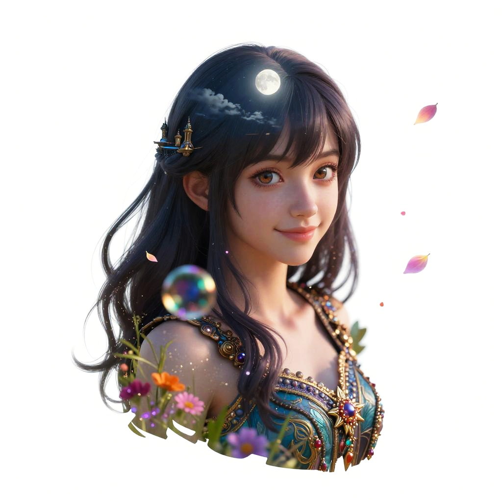 [(white background:1.5), ::5] (isometric:1.0), double exposure, bubble, mid shot, full body, //masterpiece, best quality, 1girl, (colorful), (finely detailed beautiful eyes and detailed face), cinematic lighting, bust shot, extremely detailed CG unity 8k wallpaper, smile, intricate skirt, ((flying petal)), (Flowery meadow) sky, cloudy_sky, building, moonlight, moon, night, (dark theme:1.3), light, fantasy, looking at viewer, milim nava